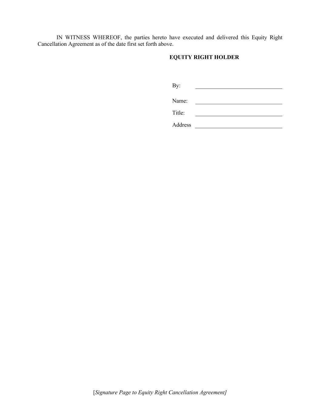 [Signature Page to Equity Right Cancellation Agreement] IN WITNESS WHEREOF, the parties hereto have executed and delivered this Equity Right Cancellation Agreement as of the date first set forth above. EQUITY RIGHT HOLDER By: Name: Title: Address