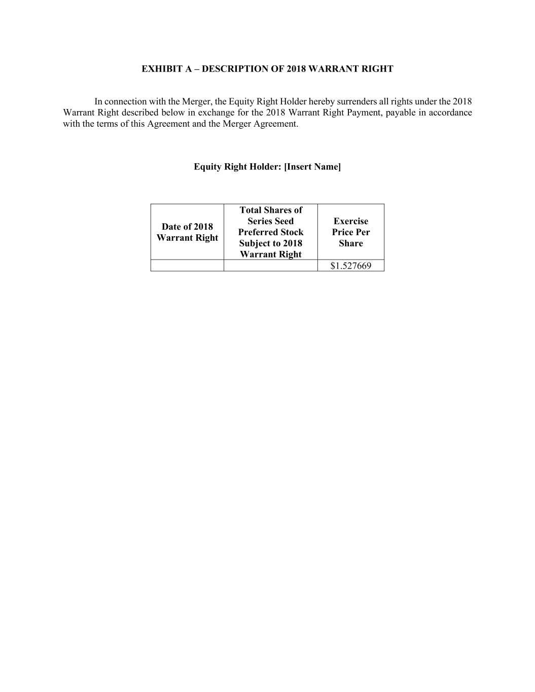 EXHIBIT A – DESCRIPTION OF 2018 WARRANT RIGHT In connection with the Merger, the Equity Right Holder hereby surrenders all rights under the 2018 Warrant Right described below in exchange for the 2018 Warrant Right Payment, payable in accordance with the terms of this Agreement and the Merger Agreement. Equity Right Holder: [Insert Name] Date of 2018 Warrant Right Total Shares of Series Seed Preferred Stock Subject to 2018 Warrant Right Exercise Price Per Share $1.527669