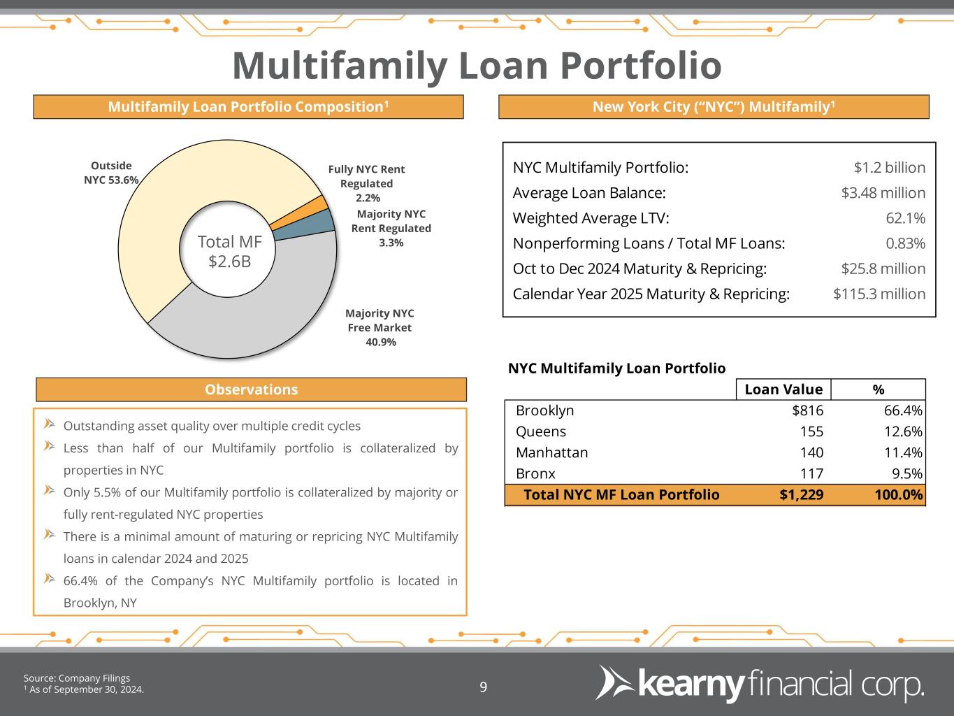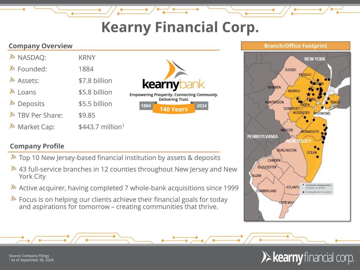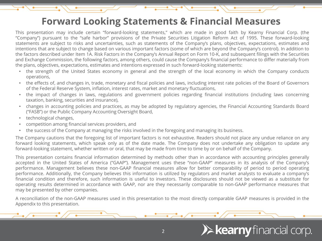 Forward Looking Statements & Financial Measures 2 This presentation may include certain “forward-looking statements,” which are made in good faith by Kearny Financial Corp. (the “Company”) pursuant to the “safe harbor” provisions of the Private Securities Litigation Reform Act of 1995. These forward-looking statements are subject to risks and uncertainties, such as statements of the Company’s plans, objectives, expectations, estimates and intentions that are subject to change based on various important factors (some of which are beyond the Company’s control). In addition to the factors described under Item 1A. Risk Factors in the Company’s Annual Report on Form 10-K, and subsequent filings with the Securities and Exchange Commission, the following factors, among others, could cause the Company’s financial performance to differ materially from the plans, objectives, expectations, estimates and intentions expressed in such forward-looking statements: • the strength of the United States economy in general and the strength of the local economy in which the Company conducts operations, • the effects of, and changes in, trade, monetary and fiscal policies and laws, including interest rate policies of the Board of Governors of the Federal Reserve System, inflation, interest rates, market and monetary fluctuations, • the impact of changes in laws, regulations and government policies regarding financial institutions (including laws concerning taxation, banking, securities and insurance), • changes in accounting policies and practices, as may be adopted by regulatory agencies, the Financial Accounting Standards Board (“FASB”) or the Public Company Accounting Oversight Board, • technological changes, • competition among financial services providers, and • the success of the Company at managing the risks involved in the foregoing and managing its business. The Company cautions that the foregoing list of important factors is not exhaustive. Readers should not place any undue reliance on any forward looking statements, which speak only as of the date made. The Company does not undertake any obligation to update any forward-looking statement, whether written or oral, that may be made from time to time by or on behalf of the Company. This presentation contains financial information determined by methods other than in accordance with accounting principles generally accepted in the United States of America (“GAAP”). Management uses these “non-GAAP” measures in its analysis of the Company’s performance. Management believes these non-GAAP financial measures allow for better comparability of period to period operating performance. Additionally, the Company believes this information is utilized by regulators and market analysts to evaluate a company’s financial condition and therefore, such information is useful to investors. These disclosures should not be viewed as a substitute for operating results determined in accordance with GAAP, nor are they necessarily comparable to non-GAAP performance measures that may be presented by other companies. A reconciliation of the non-GAAP measures used in this presentation to the most directly comparable GAAP measures is provided in the Appendix to this presentation.