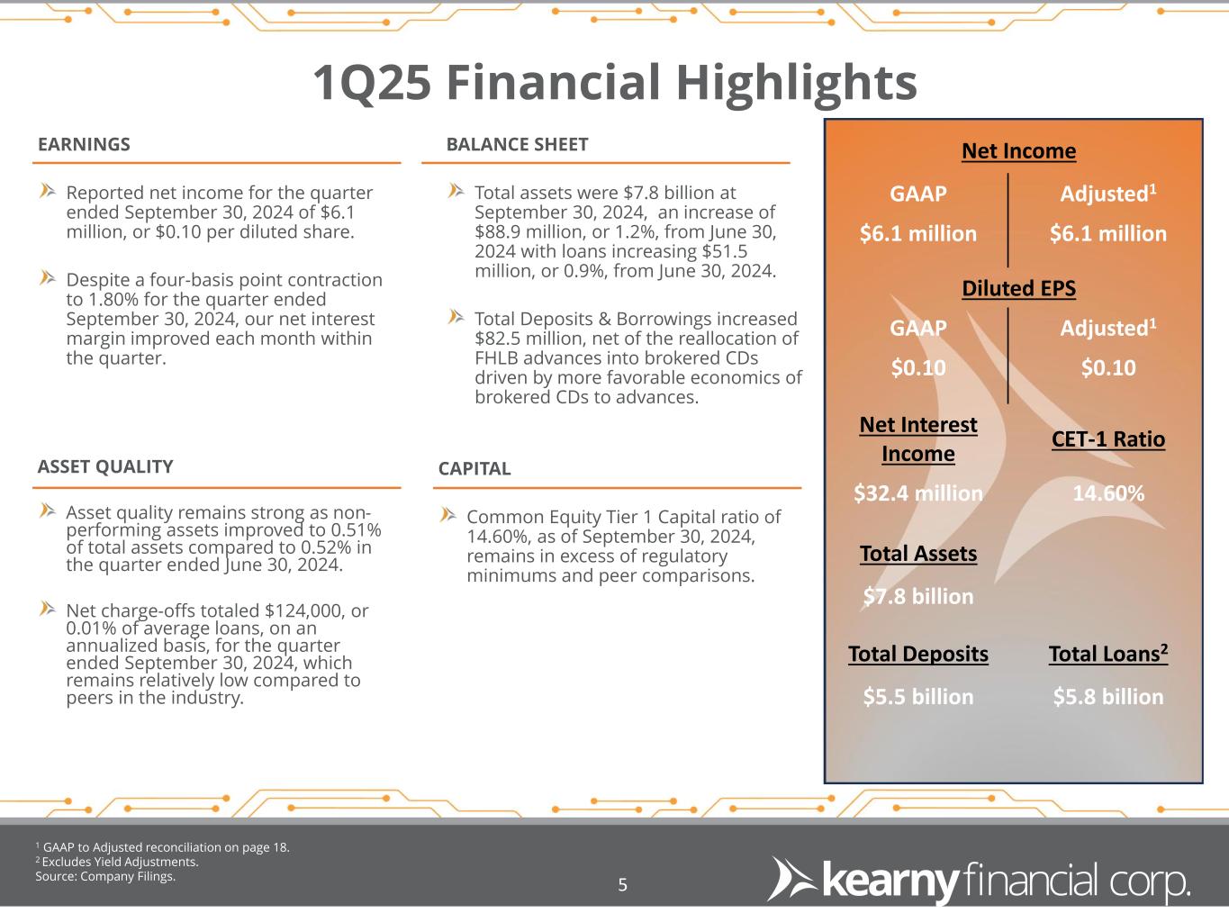4 Founded Kearny, NJ 1884 Obtained Federal Charter 1941 South Bergen Savings Bank Acquired 1999 Pulaski Bancorp Acquired 2003 West Essex Bank Acquired 2004 Completed First-Step Mutual Conversion & IPO of $218.2M 2005 Central Jersey Bancorp Acquired 2011 Atlas Bank Acquired 2014 Formed the KearnyBank foundation funded with $10M 2015 Completed Second-Step Conversion and $717.5M Stock Offering 2015 Converted to NJ State - Chartered Savings Bank 2017 Clifton Bancorp Acquired 2018 MSB Financial Corp. Acquired 2020 Introduced Private Client Services 2021 Established Kearny Investment Services 2022 140 Years: Franchise Milestones “Serving our Communities and Clients”