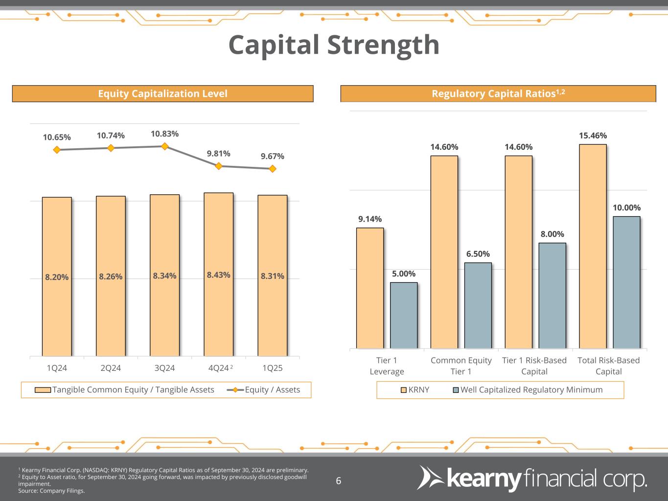 1Q25 Financial Highlights 1 GAAP to Adjusted reconciliation on page 18. 2 Excludes Yield Adjustments. Source: Company Filings. 5 Net Income GAAP Adjusted1 $6.1 million $6.1 million Diluted EPS GAAP Adjusted1 $0.10 $0.10 Net Interest Income CET-1 Ratio $32.4 million 14.60% Total Assets $7.8 billion Total Deposits Total Loans2 $5.5 billion $5.8 billion ASSET QUALITY Asset quality remains strong as non- performing assets improved to 0.51% of total assets compared to 0.52% in the quarter ended June 30, 2024. Net charge-offs totaled $124,000, or 0.01% of average loans, on an annualized basis, for the quarter ended September 30, 2024, which remains relatively low compared to peers in the industry. EARNINGS Reported net income for the quarter ended September 30, 2024 of $6.1 million, or $0.10 per diluted share. Despite a four-basis point contraction to 1.80% for the quarter ended September 30, 2024, our net interest margin improved each month within the quarter. BALANCE SHEET Total assets were $7.8 billion at September 30, 2024, an increase of $88.9 million, or 1.2%, from June 30, 2024 with loans increasing $51.5 million, or 0.9%, from June 30, 2024. Total Deposits & Borrowings increased $82.5 million, net of the reallocation of FHLB advances into brokered CDs driven by more favorable economics of brokered CDs to advances. CAPITAL Common Equity Tier 1 Capital ratio of 14.60%, as of September 30, 2024, remains in excess of regulatory minimums and peer comparisons.