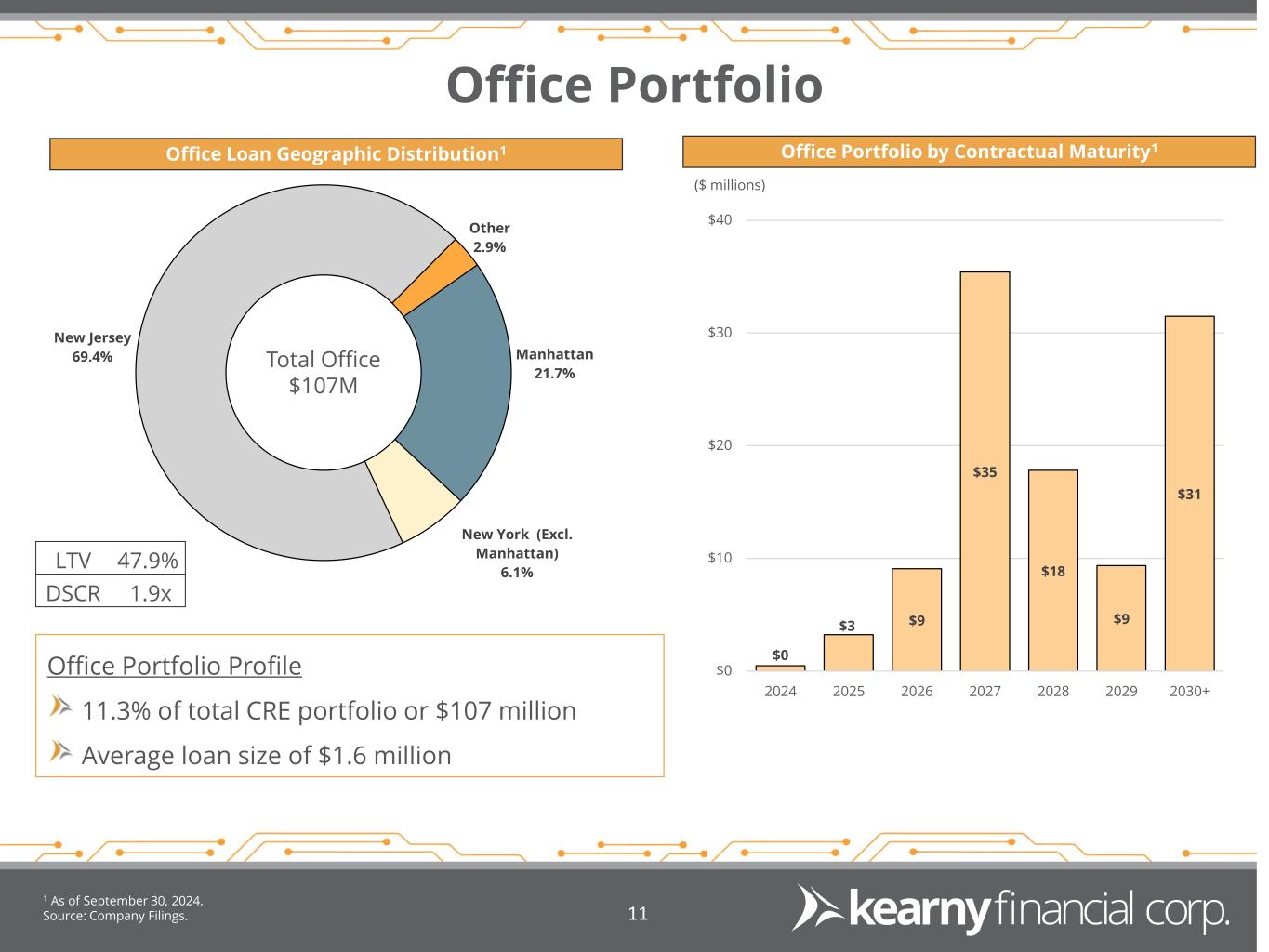 CRE Loan Detail Source: Company Filings. 1 As of September 30, 2024. 10 CRE Portfolio by Collateral Type1 CRE Loan Geographic Distribution1 Retail 34.1% Mixed Use 28.5% Office 11.3% Industrial 16.6% Specialty & Other 5.1% Medical 4.4% New Jersey 56.7% Brooklyn 9.3% New York (Ex. Brooklyn) 25.8% Pennsylvania 4.8% Other 3.4% Total CRE $951M LTV 52.5%