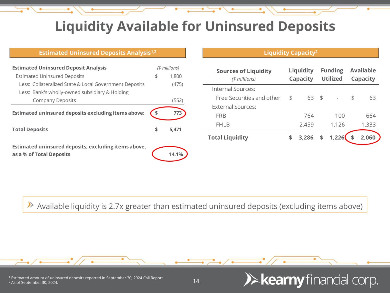 •At September 30, 2024, the Company maintained available secured borrowing capacity with the FHLB and the Federal Reserve Discount Window of $2.06 billion, an increase of $240.0 million from June 30, 2024, and represents 26.5% of total assets.