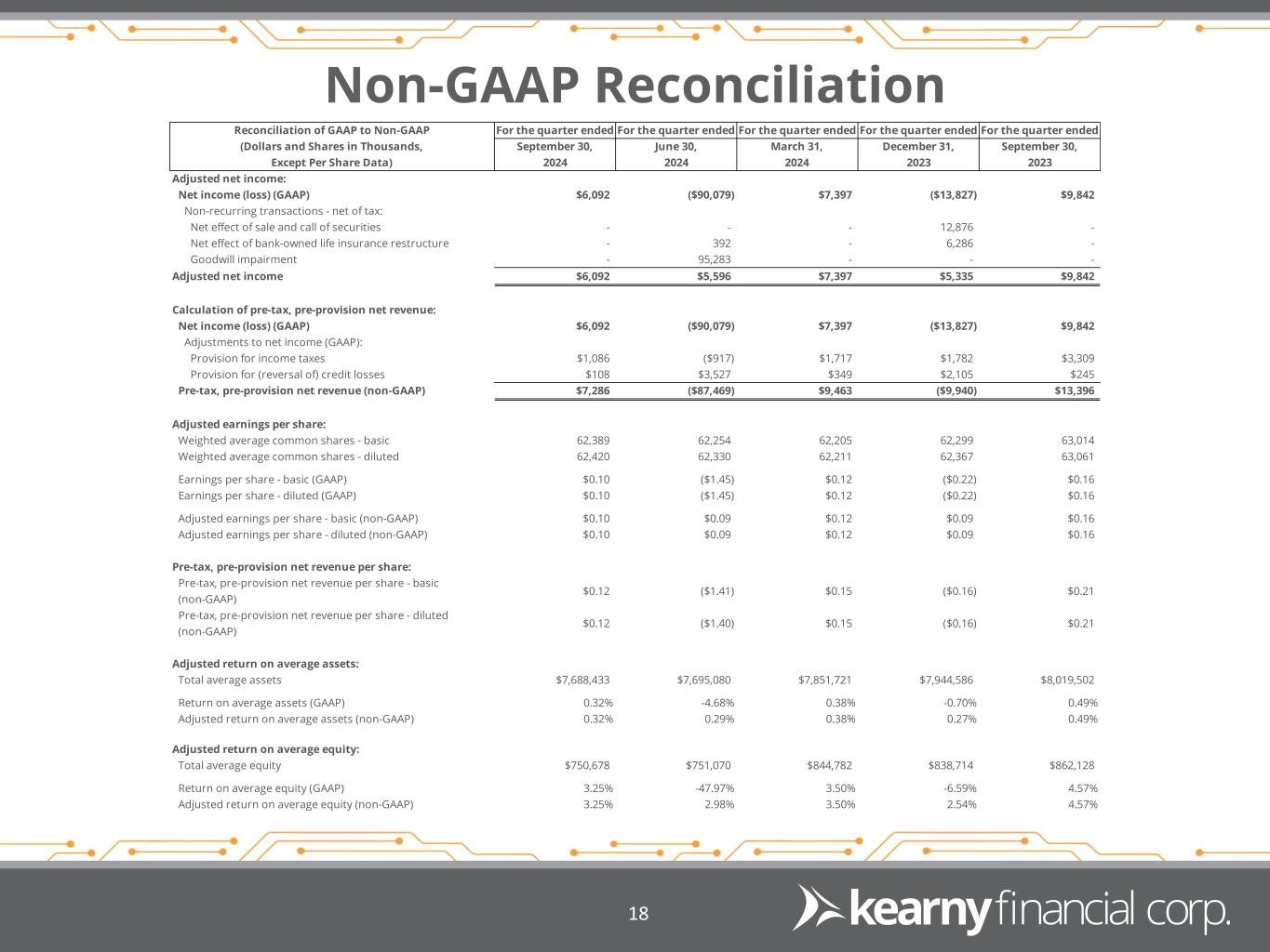 Fairfield, N.J., October 24, 2024 – Kearny Financial Corp. (NASDAQ GS: KRNY) (the “Company”), the holding company of Kearny Bank (the “Bank”), reported net income for the quarter ended September 30, 2024 of $6.1 million, or $0.10 per diluted share, compared to a GAAP net loss of $90.1 million, or $1.45 per diluted share, for the quarter ended June 30, 2024. The net loss for the quarter ended June 30, 2024 included a goodwill impairment of $95.3 million, as previously disclosed. Excluding this item, net income for the quarter ended September 30, 2024 increased $496,000 from adjusted net income of $5.6 million for the quarter ended June 30, 2024.