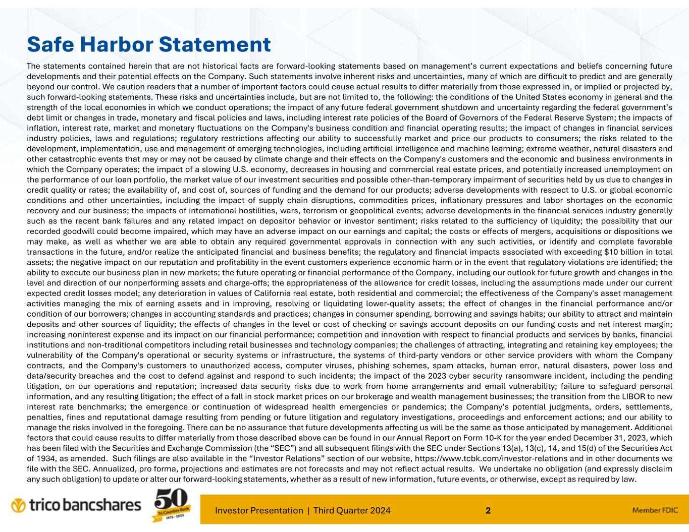 Investor Presentation | Third Quarter 2024 2 Safe Harbor Statement The statements contained herein that are not historical facts are forward-looking statements based on management’s current expectations and beliefs concerning future developments and their potential effects on the Company. Such statements involve inherent risks and uncertainties, many of which are difficult to predict and are generally beyond our control. We caution readers that a number of important factors could cause actual results to differ materially from those expressed in, or implied or projected by, such forward-looking statements. These risks and uncertainties include, but are not limited to, the following: the conditions of the United States economy in general and the strength of the local economies in which we conduct operations; the impact of any future federal government shutdown and uncertainty regarding the federal government’s debt limit or changes in trade, monetary and fiscal policies and laws, including interest rate policies of the Board of Governors of the Federal Reserve System; the impacts of inflation, interest rate, market and monetary fluctuations on the Company's business condition and financial operating results; the impact of changes in financial services industry policies, laws and regulations; regulatory restrictions affecting our ability to successfully market and price our products to consumers; the risks related to the development, implementation, use and management of emerging technologies, including artificial intelligence and machine learning; extreme weather, natural disasters and other catastrophic events that may or may not be caused by climate change and their effects on the Company's customers and the economic and business environments in which the Company operates; the impact of a slowing U.S. economy, decreases in housing and commercial real estate prices, and potentially increased unemployment on the performance of our loan portfolio, the market value of our investment securities and possible other-than-temporary impairment of securities held by us due to changes in credit quality or rates; the availability of, and cost of, sources of funding and the demand for our products; adverse developments with respect to U.S. or global economic conditions and other uncertainties, including the impact of supply chain disruptions, commodities prices, inflationary pressures and labor shortages on the economic recovery and our business; the impacts of international hostilities, wars, terrorism or geopolitical events; adverse developments in the financial services industry generally such as the recent bank failures and any related impact on depositor behavior or investor sentiment; risks related to the sufficiency of liquidity; the possibility that our recorded goodwill could become impaired, which may have an adverse impact on our earnings and capital; the costs or effects of mergers, acquisitions or dispositions we may make, as well as whether we are able to obtain any required governmental approvals in connection with any such activities, or identify and complete favorable transactions in the future, and/or realize the anticipated financial and business benefits; the regulatory and financial impacts associated with exceeding $10 billion in total assets; the negative impact on our reputation and profitability in the event customers experience economic harm or in the event that regulatory violations are identified; the ability to execute our business plan in new markets; the future operating or financial performance of the Company, including our outlook for future growth and changes in the level and direction of our nonperforming assets and charge-offs; the appropriateness of the allowance for credit losses, including the assumptions made under our current expected credit losses model; any deterioration in values of California real estate, both residential and commercial; the effectiveness of the Company's asset management activities managing the mix of earning assets and in improving, resolving or liquidating lower-quality assets; the effect of changes in the financial performance and/or condition of our borrowers; changes in accounting standards and practices; changes in consumer spending, borrowing and savings habits; our ability to attract and maintain deposits and other sources of liquidity; the effects of changes in the level or cost of checking or savings account deposits on our funding costs and net interest margin; increasing noninterest expense and its impact on our financial performance; competition and innovation with respect to financial products and services by banks, financial institutions and non-traditional competitors including retail businesses and technology companies; the challenges of attracting, integrating and retaining key employees; the vulnerability of the Company's operational or security systems or infrastructure, the systems of third-party vendors or other service providers with whom the Company contracts, and the Company's customers to unauthorized access, computer viruses, phishing schemes, spam attacks, human error, natural disasters, power loss and data/security breaches and the cost to defend against and respond to such incidents; the impact of the 2023 cyber security ransomware incident, including the pending litigation, on our operations and reputation; increased data security risks due to work from home arrangements and email vulnerability; failure to safeguard personal information, and any resulting litigation; the effect of a fall in stock market prices on our brokerage and wealth management businesses; the transition from the LIBOR to new interest rate benchmarks; the emergence or continuation of widespread health emergencies or pandemics; the Company’s potential judgments, orders, settlements, penalties, fines and reputational damage resulting from pending or future litigation and regulatory investigations, proceedings and enforcement actions; 