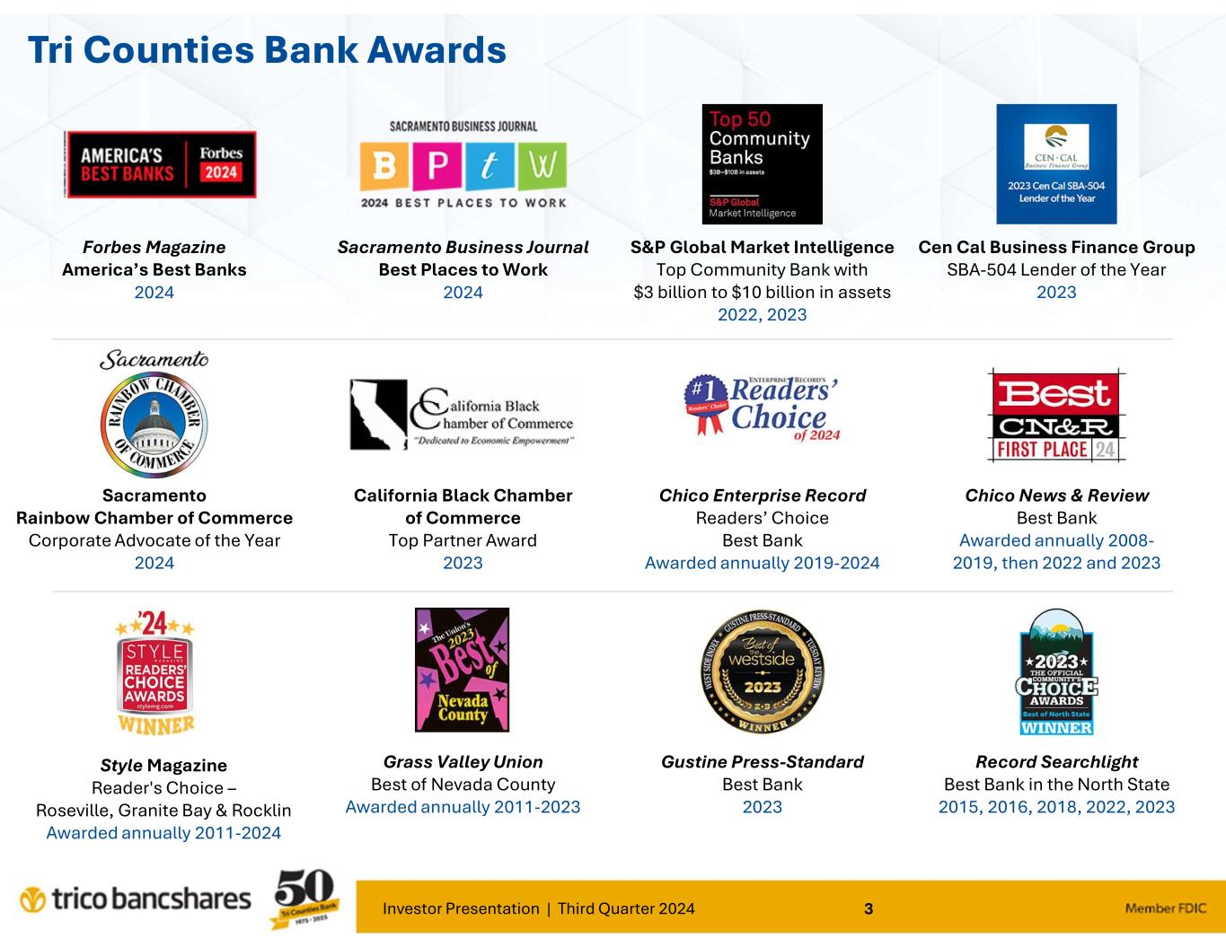 Investor Presentation | Third Quarter 2024 3 Tri Counties Bank Awards S&P Global Market Intelligence Top Community Bank with $3 billion to $10 billion in assets 2022, 2023 Grass Valley Union Best of Nevada County Awarded annually 2011-2023 Forbes Magazine America’s Best Banks 2024 Sacramento Business Journal Best Places to Work 2024 Sacramento Rainbow Chamber of Commerce Corporate Advocate of the Year 2024 Cen Cal Business Finance Group SBA-504 Lender of the Year 2023 Chico Enterprise Record Readers’ Choice Best Bank Awarded annually 2019-2024 Gustine Press-Standard Best Bank 2023 Style Magazine Reader's Choice – Roseville, Granite Bay & Rocklin Awarded annually 2011-2024 California Black Chamber of Commerce Top Partner Award 2023 Chico News & Review Best Bank Awarded annually 2008- 2019, then 2022 and 2023 Record Searchlight Best Bank in the North State 2015, 2016, 2018, 2022, 2023