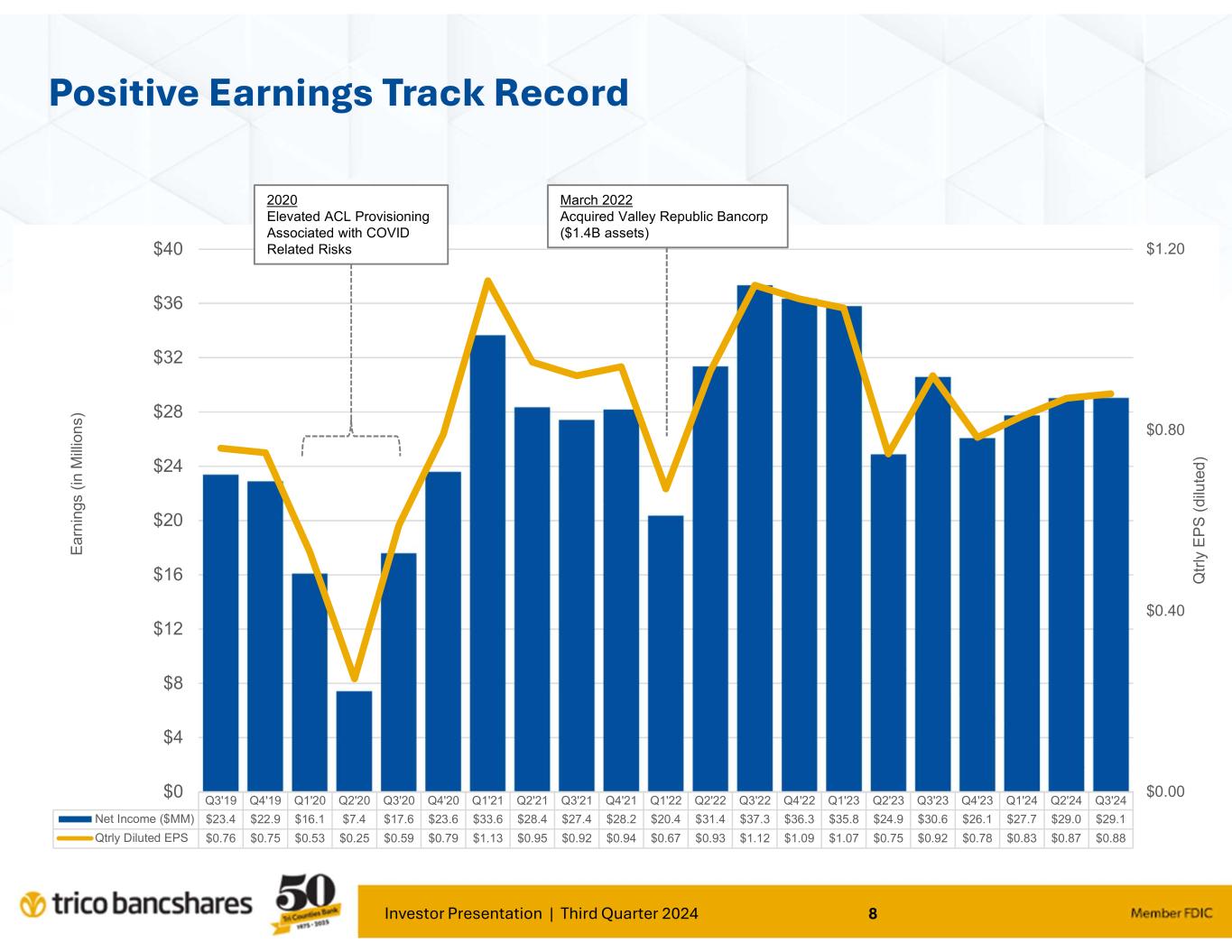 Investor Presentation | Third Quarter 2024 7 Company Overview Nasdaq: TCBK Headquarters: Chico, California Stock Price*: $42.65 Market Cap.: $1.41 Billion Asset Size: $9.82 Billion Loans: $6.68 Billion Deposits: $8.04 Billion Bank Branches: 68 ATMs: 84 Bank ATMs, with access to ~ 40,000 in network Market Area: TriCo currently serves 31 counties throughout California * As of close of business September 30, 2024