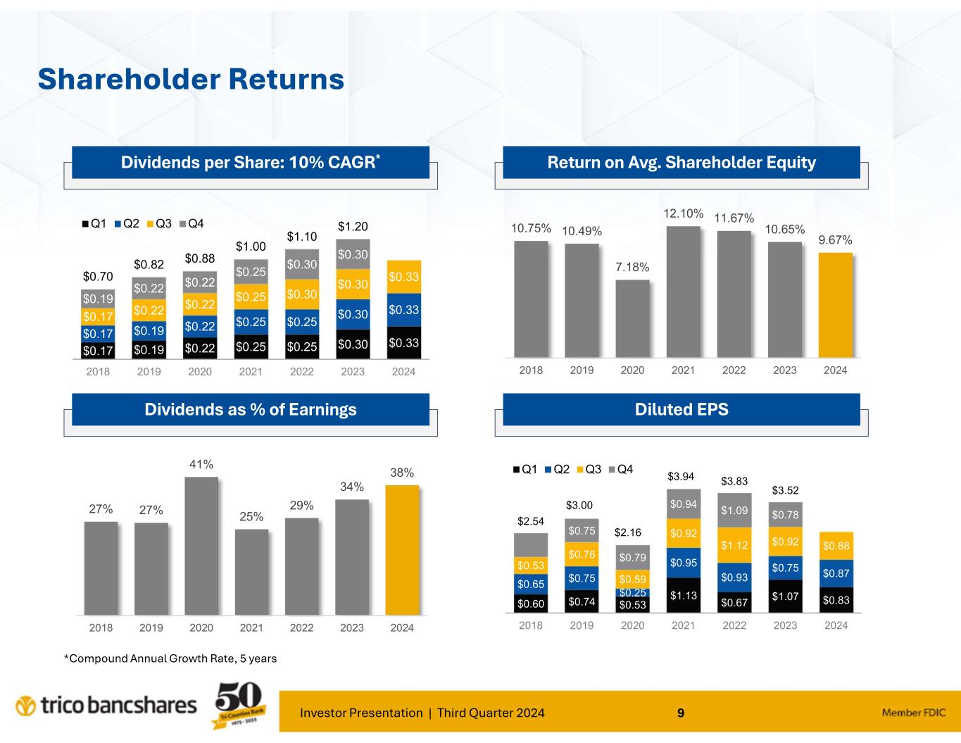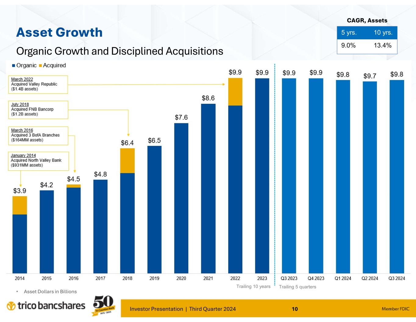 Investor Presentation | Third Quarter 2024 8 Q3'19 Q4'19 Q1'20 Q2'20 Q3'20 Q4'20 Q1'21 Q2'21 Q3'21 Q4'21 Q1'22 Q2'22 Q3'22 Q4'22 Q1'23 Q2'23 Q3'23 Q4'23 Q1'24 Q2'24 Q3'24 Net Income ($MM) $23.4 $22.9 $16.1 $7.4 $17.6 $23.6 $33.6 $28.4 $27.4 $28.2 $20.4 $31.4 $37.3 $36.3 $35.8 $24.9 $30.6 $26.1 $27.7 $29.0 $29.1 Qtrly Diluted EPS $0.76 $0.75 $0.53 $0.25 $0.59 $0.79 $1.13 $0.95 $0.92 $0.94 $0.67 $0.93 $1.12 $1.09 $1.07 $0.75 $0.92 $0.78 $0.83 $0.87 $0.88 $0.00 $0.40 $0.80 $1.20 $0 $4 $8 $12 $16 $20 $24 $28 $32 $36 $40 Q tr ly E P S ( di lu te d) E a rn in gs ( in M ill io n s) Positive Earnings Track Record March 2022 Acquired Valley Republic Bancorp ($1.4B assets) 2020 Elevated ACL Provisioning Associated with COVID Related Risks