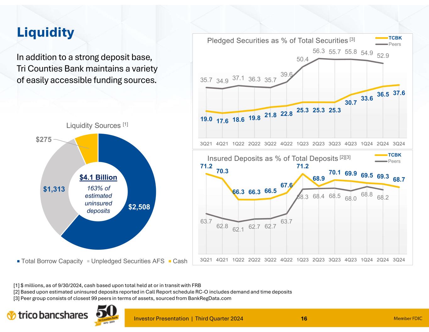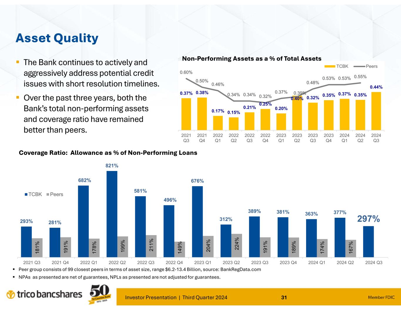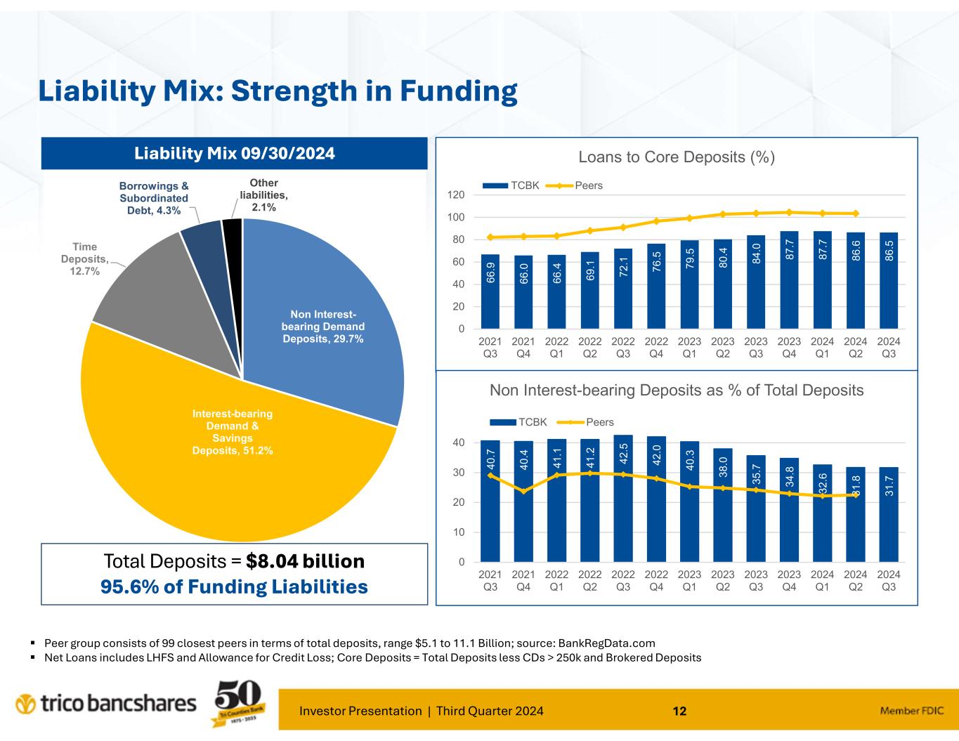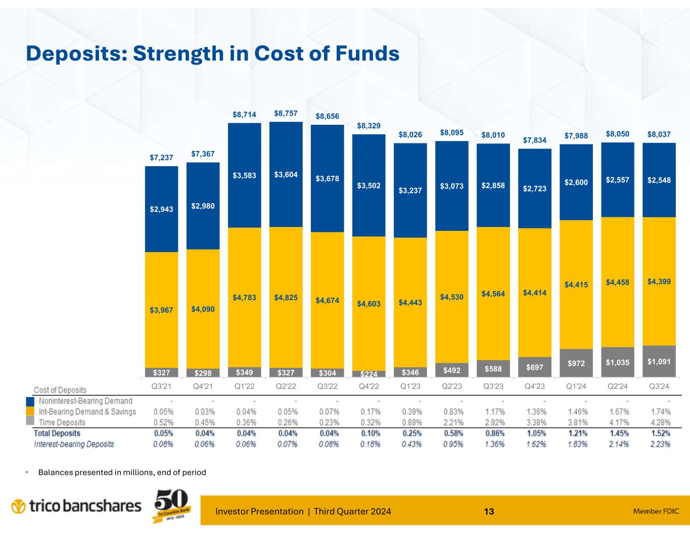 Investor Presentation | Third Quarter 2024 12 Non Interest- bearing Demand Deposits, 29.7% Interest-bearing Demand & Savings Deposits, 51.2% Time Deposits, 12.7% Borrowings & Subordinated Debt, 4.3% Other liabilities, 2.1% Liability Mix: Strength in Funding Total Deposits = $8.04 billion 95.6% of Funding Liabilities Liability Mix 09/30/2024 Peer group consists of 99 closest peers in terms of total deposits, range $5.1 to 11.1 Billion; source: BankRegData.com Net Loans includes LHFS and Allowance for Credit Loss; Core Deposits = Total Deposits less CDs > 250k and Brokered Deposits 6 6 .9 6 6 .0 6 6 .4 6 9 .1 7 2 .1 7 6 .5 7 9 .5 8 0 .4 8 4 .0 8 7 .7 8 7 .7 8 6 .6 8 6 .5 0 20 40 60 80 100 120 2021 Q3 2021 Q4 2022 Q1 2022 Q2 2022 Q3 2022 Q4 2023 Q1 2023 Q2 2023 Q3 2023 Q4 2024 Q1 2024 Q2 2024 Q3 Loans to Core Deposits (%) TCBK Peers 4 0 .7 4 0 .4 4 1 .1 4 1 .2 4 2 .5 4 2 .0 4 0 .3 3 8 .0 3 5 .7 3 4 .8 3 2 .6 3 1 .8 3 1 .7 0 10 20 30 40 2021 Q3 2021 Q4 2022 Q1 2022 Q2 2022 Q3 2022 Q4 2023 Q1 2023 Q2 2023 Q3 2023 Q4 2024 Q1 2024 Q2 2024 Q3 Non Interest-bearing Deposits as % of Total Deposits TCBK Peers
