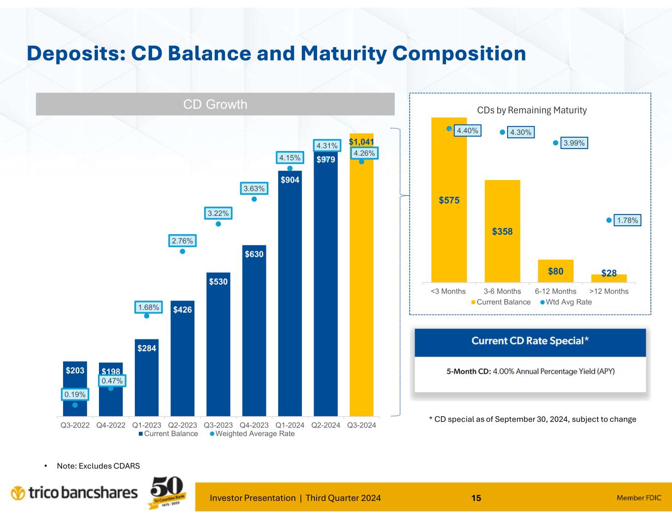 Investor Presentation | Third Quarter 2024 15 $575 $358 $80 $28 4.40% 4.30% 3.99% 1.78% 0.00% 0.50% 1.00% 1.50% 2.00% 2.50% 3.00% 3.50% 4.00% 4.50% 5.00% $0 $100 $200 $300 $400 $500 $600 <3 Months 3-6 Months 6-12 Months >12 Months Current Balance Wtd Avg Rate CDs by Remaining Maturity $203 $198 $284 $426 $530 $630 $904 $979 $1,041 0.19% 0.47% 1.68% 2.76% 3.22% 3.63% 4.15% 4.31% 4.26% 0.00% 0.50% 1.00% 1.50% 2.00% 2.50% 3.00% 3.50% 4.00% 4.50% 5.00% $0.00 $200.00 $400.00 $600.00 $800.00 $1,000.00 Q3-2022 Q4-2022 Q1-2023 Q2-2023 Q3-2023 Q4-2023 Q1-2024 Q2-2024 Q3-2024 Current Balance Weighted Average Rate CD Growth Deposits: CD Balance and Maturity Composition • Note: Excludes CDARS * CD special as of September 30, 2024, subject to change