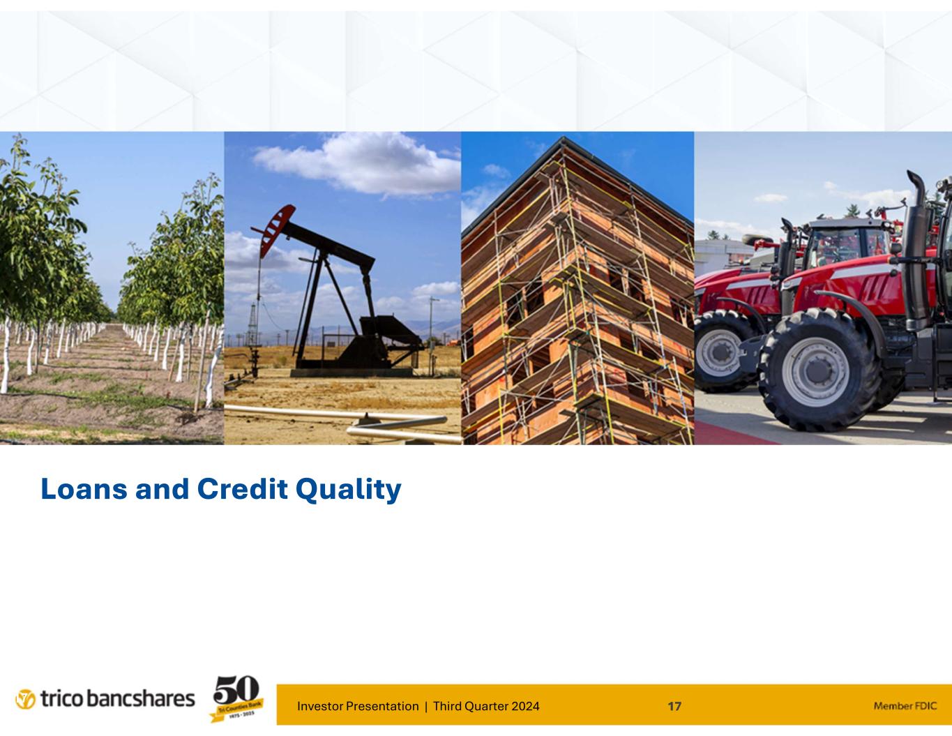 Investor Presentation | Third Quarter 2024 16 Liquidity [1] $ millions, as of 9/30/2024, cash based upon total held at or in transit with FRB [2] Based upon estimated uninsured deposits reported in Call Report schedule RC-O includes demand and time deposits [3] Peer group consists of closest 99 peers in terms of assets, sourced from BankRegData.com $4.1 Billion 163% of estimated uninsured deposits In addition to a strong deposit base, Tri Counties Bank maintains a variety of easily accessible funding sources. $2,508 $1,313 $275 Liquidity Sources [1] Total Borrow Capacity Unpledged Securities AFS Cash 71.2 70.3 66.3 66.3 66.5 67.6 71.2 68.9 70.1 69.9 69.5 69.3 68.7 63.7 62.8 62.1 62.7 62.7 63.7 68.3 68.4 68.5 68.0 68.8 68.2 3Q21 4Q21 1Q22 2Q22 3Q22 4Q22 1Q23 2Q23 3Q23 4Q23 1Q24 2Q24 3Q24 Insured Deposits as % of Total Deposits [2][3] TCBK Peers 19.0 17.6 18.6 19.8 21.8 22.8 25.3 25.3 25.3 30.7 33.6 36.5 37.6 35.7 34.9 37.1 36.3 35.7 39.6 50.4 56.3 55.7 55.8 54.9 52.9 3Q21 4Q21 1Q22 2Q22 3Q22 4Q22 1Q23 2Q23 3Q23 4Q23 1Q24 2Q24 3Q24 Pledged Securities as % of Total Securities [3] TCBK Peers