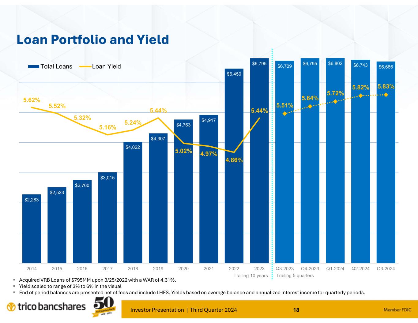 Investor Presentation | Third Quarter 2024 18 Loan Portfolio and Yield Acquired VRB Loans of $795MM upon 3/25/2022 with a WAR of 4.31%. Yield scaled to range of 3% to 6% in the visual End of period balances are presented net of fees and include LHFS. Yields based on average balance and annualized interest income for quarterly periods. $2,283 $2,523 $2,760 $3,015 $4,022 $4,307 $4,763 $4,917 $6,450 $6,795 $6,709 $6,795 $6,802 $6,743 $6,686 5.62% 5.52% 5.32% 5.16% 5.24% 5.44% 5.02% 4.97% 4.86% 5.44% 5.51% 5.64% 5.72% 5.82% 5.83% 3.00% 4.00% 5.00% 6.00% $0 $1,000 $2,000 $3,000 $4,000 $5,000 $6,000 2014 2015 2016 2017 2018 2019 2020 2021 2022 2023 Q3-2023 Q4-2023 Q1-2024 Q2-2024 Q3-2024 Total Loans Loan Yield Trailing 10 years Trailing 5 quarters
