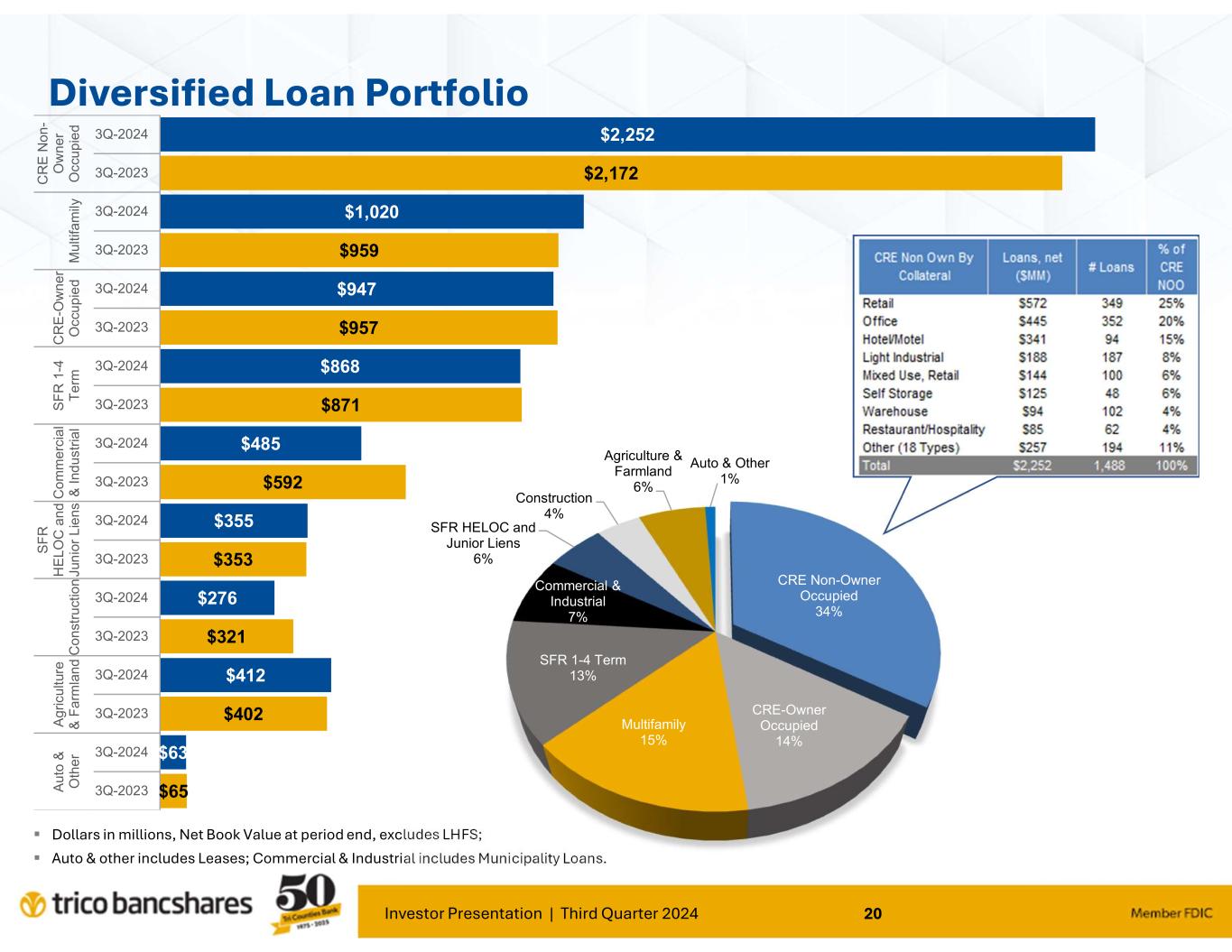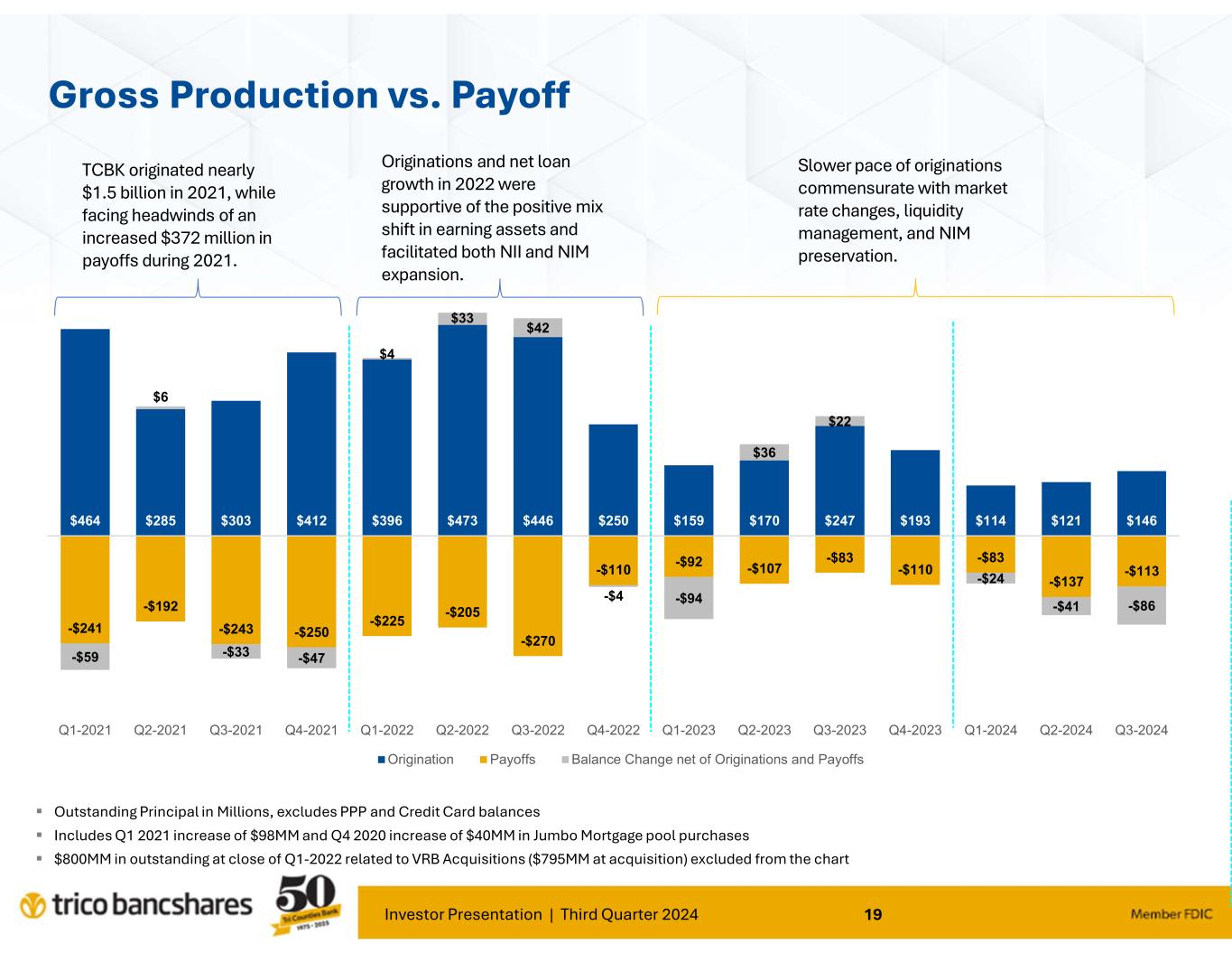 Investor Presentation | Third Quarter 2024 19 $464 $285 $303 $412 $396 $473 $446 $250 $159 $170 $247 $193 $114 $121 $146 -$241 -$192 -$243 -$250 -$225 -$205 -$270 -$110 -$92 -$107 -$83 -$110 -$83 -$137 -$113 -$59 $6 -$33 -$47 $4 $33 $42 -$4 -$94 $36 $22 -$24 -$41 -$86 Q1-2021 Q2-2021 Q3-2021 Q4-2021 Q1-2022 Q2-2022 Q3-2022 Q4-2022 Q1-2023 Q2-2023 Q3-2023 Q4-2023 Q1-2024 Q2-2024 Q3-2024 Origination Payoffs Balance Change net of Originations and Payoffs Gross Production vs. Payoff Outstanding Principal in Millions, excludes PPP and Credit Card balances Includes Q1 2021 increase of $98MM and Q4 2020 increase of $40MM in Jumbo Mortgage pool purchases $800MM in outstanding at close of Q1-2022 related to VRB Acquisitions ($795MM at acquisition) excluded from the chart TCBK originated nearly $1.5 billion in 2021, while facing headwinds of an increased $372 million in payoffs during 2021. Originations and net loan growth in 2022 were supportive of the positive mix shift in earning assets and facilitated both NII and NIM expansion. Slower pace of originations commensurate with market rate changes, liquidity management, and NIM preservation.