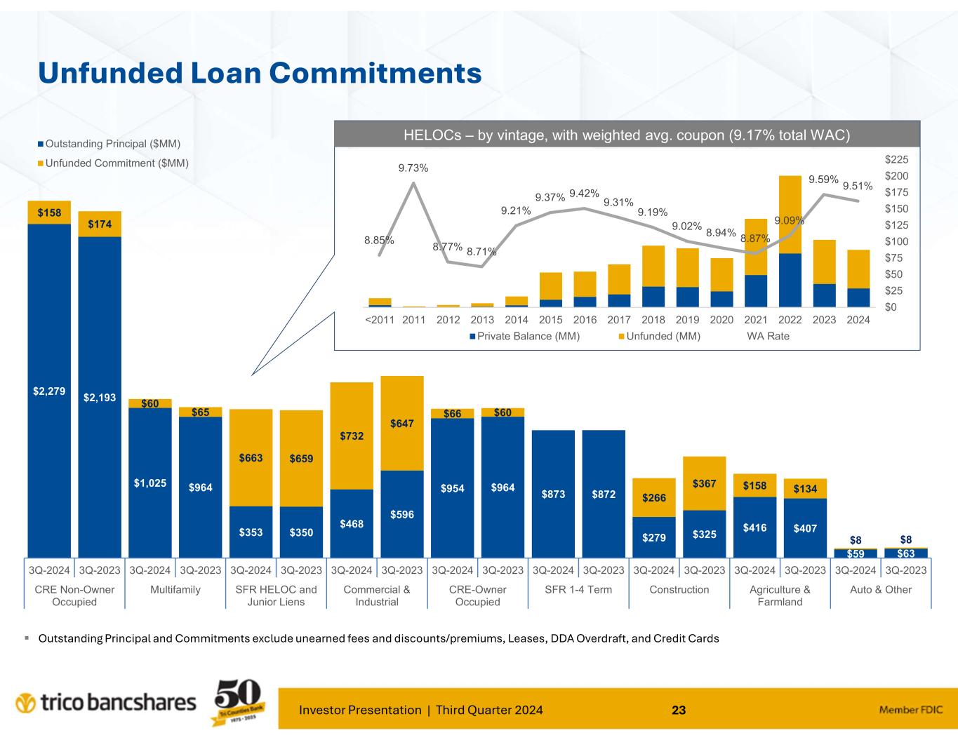 Investor Presentation | Third Quarter 2024 23 $2,279 $2,193 $1,025 $964 $353 $350 $468 $596 $954 $964 $873 $872 $279 $325 $416 $407 $59 $63 $158 $174 $60 $65 $663 $659 $732 $647 $66 $60 $266 $367 $158 $134 $8 $8 3Q-2024 3Q-2023 3Q-2024 3Q-2023 3Q-2024 3Q-2023 3Q-2024 3Q-2023 3Q-2024 3Q-2023 3Q-2024 3Q-2023 3Q-2024 3Q-2023 3Q-2024 3Q-2023 3Q-2024 3Q-2023 CRE Non-Owner Occupied Multifamily SFR HELOC and Junior Liens Commercial & Industrial CRE-Owner Occupied SFR 1-4 Term Construction Agriculture & Farmland Auto & Other Outstanding Principal ($MM) Unfunded Commitment ($MM) Unfunded Loan Commitments HELOCs – by vintage, with weighted avg. coupon (9.17% total WAC) Outstanding Principal and Commitments exclude unearned fees and discounts/premiums, Leases, DDA Overdraft, and Credit Cards 8.20% 8.40% 8.60% 8.80% 9.00% 9.20% 9.40% 9.60% 9.80% 10.00% $0 $25 $50 $75 $100 $125 $150 $175 $200 $225 20242023202220212020201920182017201620152014201320122011<2011 Private Balance (MM) Unfunded (MM) WA Rate 9.51% 9.59% 9.09% 8.87%8.94% 9.02% 9.19% 9.31% 9.42%9.37% 9.21% 8.71%8.77% 9.73% 8.85%