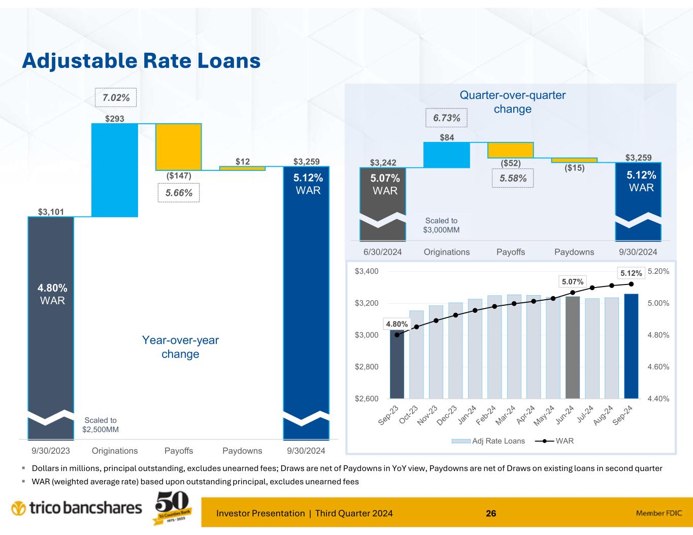 Investor Presentation | Third Quarter 2024 26 $3,242 $3,259 $84 ($52) ($15) 6/30/2024 Originations Payoffs Paydowns 9/30/2024 $3,101 ($147) $12 $3,259 $293 9/30/2023 Originations Payoffs Paydowns 9/30/2024 Adjustable Rate Loans Dollars in millions, principal outstanding, excludes unearned fees; Draws are net of Paydowns in YoY view, Paydowns are net of Draws on existing loans in second quarter WAR (weighted average rate) based upon outstanding principal, excludes unearned fees 4.80% WAR Scaled to $3,000MM Scaled to $2,500MM 4.80% WAR Year-over-year change Quarter-over-quarter change 5.12% WAR 5.07% WAR 6.73% 5.58% 7.02% 5.66% 5.12% WAR 4.80% 5.07% 5.12% 4.40% 4.60% 4.80% 5.00% 5.20% $2,600 $2,800 $3,000 $3,200 $3,400 Adj Rate Loans WAR