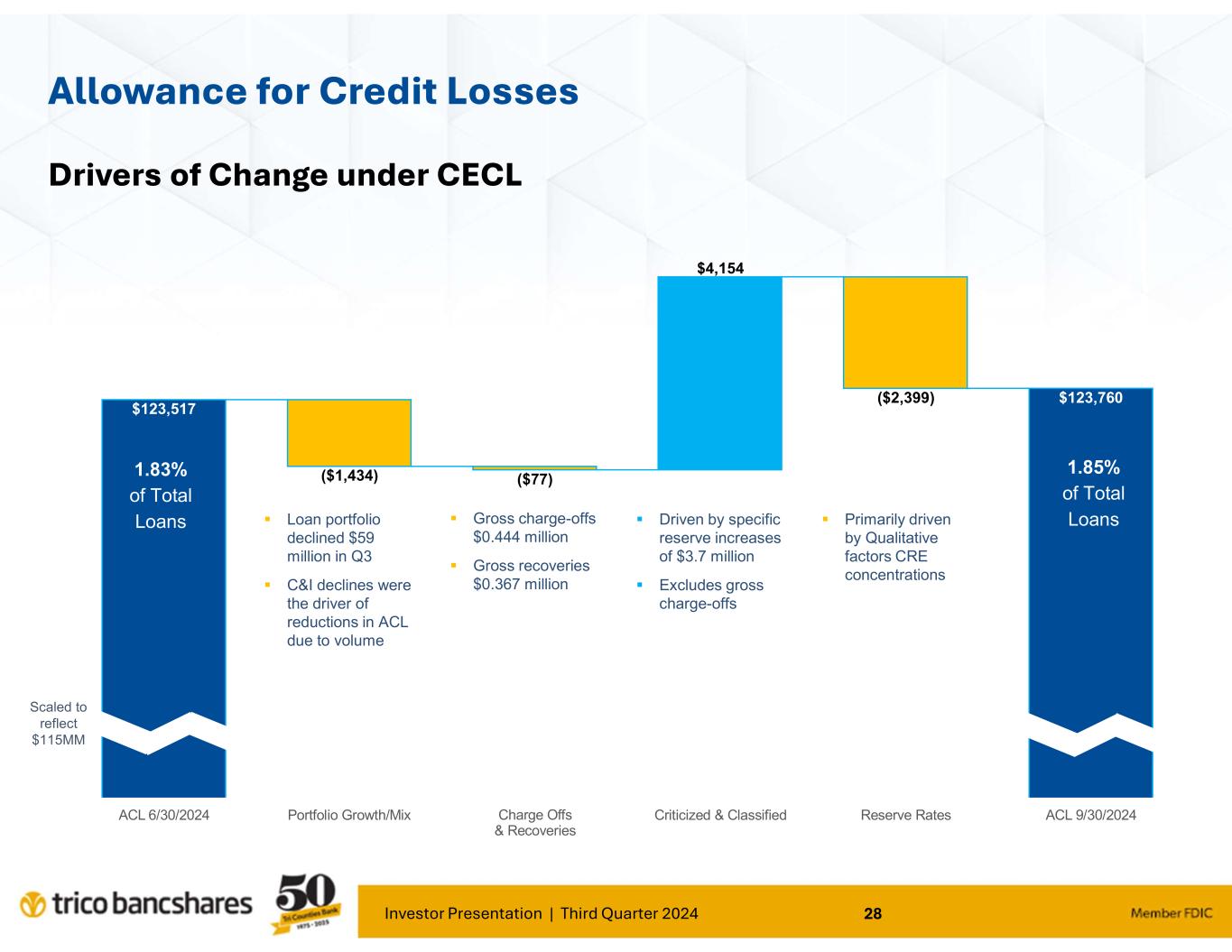 •The provision for credit losses was approximately $0.2 million during the quarter ended September 30, 2024, as compared to $0.4 million during the trailing quarter end, with reserves on individually analyzed loans increasing during the current quarter