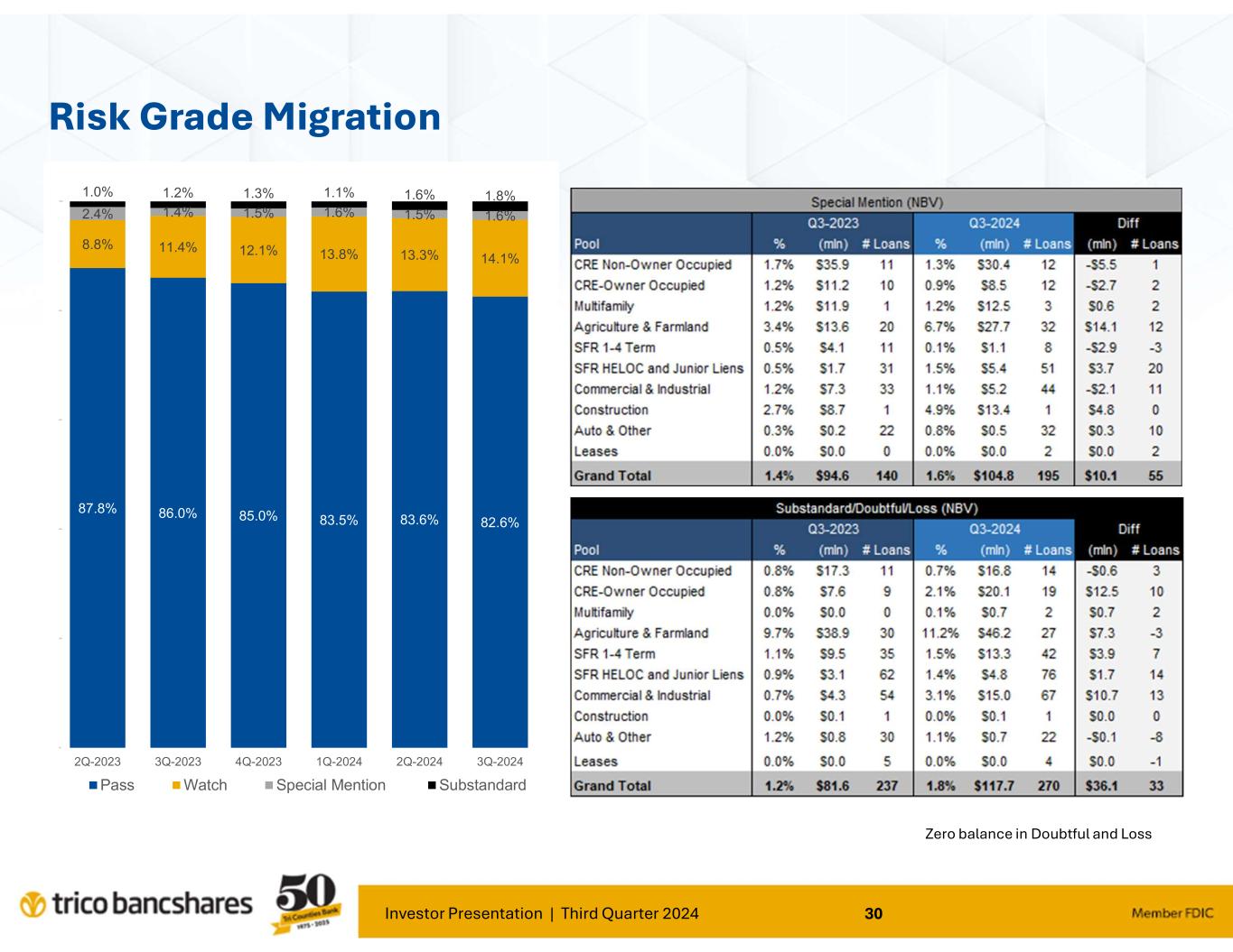 Investor Presentation | Third Quarter 2024 30 Risk Grade Migration Zero balance in Doubtful and Loss 82.6%83.6%83.5%85.0%86.0%87.8% 14.1%13.3%13.8%12.1%11.4%8.8% 1.6%1.5%1.6%1.5%1.4%2.4% 1.8%1.6%1.1%1.3%1.2%1.0% 0% 20% 40% 60% 80% 100% 3Q-20242Q-20241Q-20244Q-20233Q-20232Q-2023 Pass Watch Special Mention Substandard