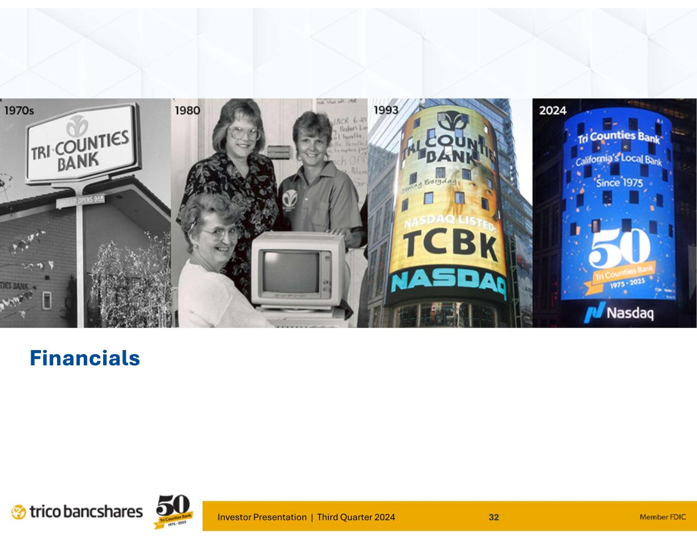 Investor Presentation | Third Quarter 2024 37 Our Mission Tri Counties Bank exists for just one purpose: to improve the financial success and well-being of our shareholders, customers, communities and employees. Core Values Trust Respect Integrity Communication Opportunity Team Ethos We are one team, aligned, customer-focused and collaborative to achieve next-level performance.