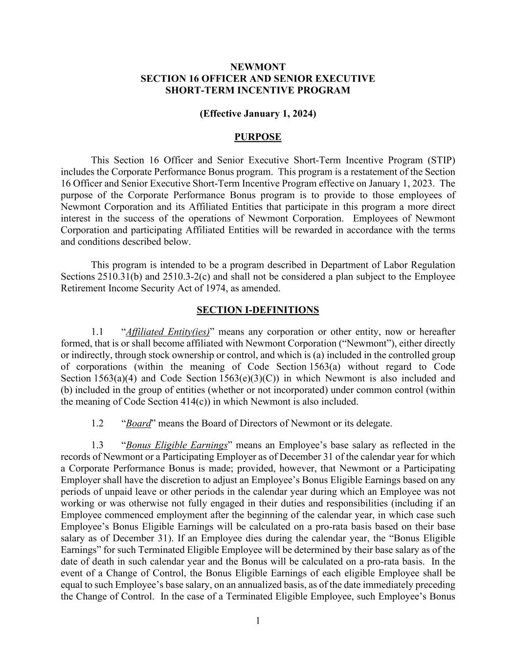 1 NEWMONT SECTION 16 OFFICER AND SENIOR EXECUTIVE SHORT-TERM INCENTIVE PROGRAM (Effective January 1, 2024) PURPOSE This Section 16 Officer and Senior Executive Short-Term Incentive Program (STIP) includes the Corporate Performance Bonus program. This program is a restatement of the Section 16 Officer and Senior Executive Short-Term Incentive Program effective on January 1, 2023. The purpose of the Corporate Performance Bonus program is to provide to those employees of Newmont Corporation and its Affiliated Entities that participate in this program a more direct interest in the success of the operations of Newmont Corporation. Employees of Newmont Corporation and participating Affiliated Entities will be rewarded in accordance with the terms and conditions described below. This program is intended to be a program described in Department of Labor Regulation Sections 2510.31(b) and 2510.3-2(c) and shall not be considered a plan subject to the Employee Retirement Income Security Act of 1974, as amended. SECTION I-DEFINITIONS 1.1 “Affiliated Entity(ies)” means any corporation or other entity, now or hereafter formed, that is or shall become affiliated with Newmont Corporation (“Newmont”), either directly or indirectly, through stock ownership or control, and which is (a) included in the controlled group of corporations (within the meaning of Code Section 1563(a) without regard to Code Section 1563(a)(4) and Code Section 1563(e)(3)(C)) in which Newmont is also included and (b) included in the group of entities (whether or not incorporated) under common control (within the meaning of Code Section 414(c)) in which Newmont is also included. 1.2 “Board” means the Board of Directors of Newmont or its delegate. 1.3 “Bonus Eligible Earnings” means an Employee’s base salary as reflected in the records of Newmont or a Participating Employer as of December 31 of the calendar year for which a Corporate Performance Bonus is made; provided, however, that Newmont or a Participating Employer shall have the discretion to adjust an Employee’s Bonus Eligible Earnings based on any periods of unpaid leave or other periods in the calendar year during which an Employee was not working or was otherwise not fully engaged in their duties and responsibilities (including if an Employee commenced employment after the beginning of the calendar year, in which case such Employee’s Bonus Eligible Earnings will be calculated on a pro-rata basis based on their base salary as of December 31). If an Employee dies during the calendar year, the “Bonus Eligible Earnings” for such Terminated Eligible Employee will be determined by their base salary as of the date of death in such calendar year and the Bonus will be calculated on a pro-rata basis. In the event of a Change of Control, the Bonus Eligible Earnings of each eligible Employee shall be equal to such Employee’s base salary, on an annualized basis, as of the date immediately preceding the Change of Control. In the case of a Terminated Eligible Employee, such Employee’s Bonus