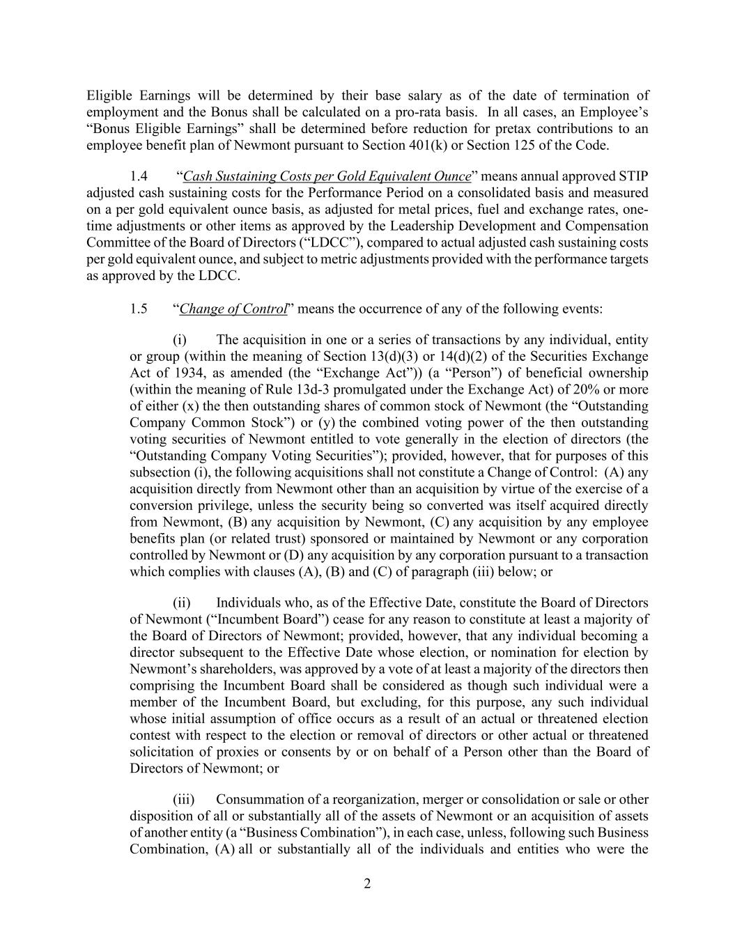 2 Eligible Earnings will be determined by their base salary as of the date of termination of employment and the Bonus shall be calculated on a pro-rata basis. In all cases, an Employee’s “Bonus Eligible Earnings” shall be determined before reduction for pretax contributions to an employee benefit plan of Newmont pursuant to Section 401(k) or Section 125 of the Code. 1.4 “Cash Sustaining Costs per Gold Equivalent Ounce” means annual approved STIP adjusted cash sustaining costs for the Performance Period on a consolidated basis and measured on a per gold equivalent ounce basis, as adjusted for metal prices, fuel and exchange rates, one- time adjustments or other items as approved by the Leadership Development and Compensation Committee of the Board of Directors (“LDCC”), compared to actual adjusted cash sustaining costs per gold equivalent ounce, and subject to metric adjustments provided with the performance targets as approved by the LDCC. 1.5 “Change of Control” means the occurrence of any of the following events: (i) The acquisition in one or a series of transactions by any individual, entity or group (within the meaning of Section 13(d)(3) or 14(d)(2) of the Securities Exchange Act of 1934, as amended (the “Exchange Act”)) (a “Person”) of beneficial ownership (within the meaning of Rule 13d-3 promulgated under the Exchange Act) of 20% or more of either (x) the then outstanding shares of common stock of Newmont (the “Outstanding Company Common Stock”) or (y) the combined voting power of the then outstanding voting securities of Newmont entitled to vote generally in the election of directors (the “Outstanding Company Voting Securities”); provided, however, that for purposes of this subsection (i), the following acquisitions shall not constitute a Change of Control: (A) any acquisition directly from Newmont other than an acquisition by virtue of the exercise of a conversion privilege, unless the security being so converted was itself acquired directly from Newmont, (B) any acquisition by Newmont, (C) any acquisition by any employee benefits plan (or related trust) sponsored or maintained by Newmont or any corporation controlled by Newmont or (D) any acquisition by any corporation pursuant to a transaction which complies with clauses (A), (B) and (C) of paragraph (iii) below; or (ii) Individuals who, as of the Effective Date, constitute the Board of Directors of Newmont (“Incumbent Board”) cease for any reason to constitute at least a majority of the Board of Directors of Newmont; provided, however, that any individual becoming a director subsequent to the Effective Date whose election, or nomination for election by Newmont’s shareholders, was approved by a vote of at least a majority of the directors then comprising the Incumbent Board shall be considered as though such individual were a member of the Incumbent Board, but excluding, for this purpose, any such individual whose initial assumption of office occurs as a result of an actual or threatened election contest with respect to the election or removal of directors or other actual or threatened solicitation of proxies or consents by or on behalf of a Person other than the Board of Directors of Newmont; or (iii) Consummation of a reorganization, merger or consolidation or sale or other disposition of all or substantially all of the assets of Newmont or an acquisition of assets of another entity (a “Business Combination”), in each case, unless, following such Business Combination, (A) all or substantially all of the individuals and entities who were the