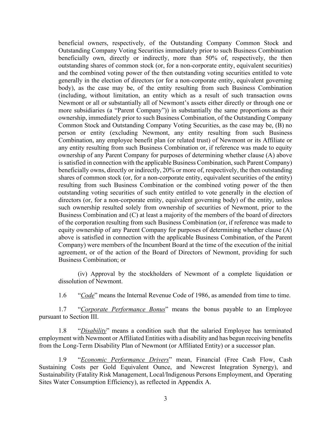 3 beneficial owners, respectively, of the Outstanding Company Common Stock and Outstanding Company Voting Securities immediately prior to such Business Combination beneficially own, directly or indirectly, more than 50% of, respectively, the then outstanding shares of common stock (or, for a non-corporate entity, equivalent securities) and the combined voting power of the then outstanding voting securities entitled to vote generally in the election of directors (or for a non-corporate entity, equivalent governing body), as the case may be, of the entity resulting from such Business Combination (including, without limitation, an entity which as a result of such transaction owns Newmont or all or substantially all of Newmont’s assets either directly or through one or more subsidiaries (a “Parent Company”)) in substantially the same proportions as their ownership, immediately prior to such Business Combination, of the Outstanding Company Common Stock and Outstanding Company Voting Securities, as the case may be, (B) no person or entity (excluding Newmont, any entity resulting from such Business Combination, any employee benefit plan (or related trust) of Newmont or its Affiliate or any entity resulting from such Business Combination or, if reference was made to equity ownership of any Parent Company for purposes of determining whether clause (A) above is satisfied in connection with the applicable Business Combination, such Parent Company) beneficially owns, directly or indirectly, 20% or more of, respectively, the then outstanding shares of common stock (or, for a non-corporate entity, equivalent securities of the entity) resulting from such Business Combination or the combined voting power of the then outstanding voting securities of such entity entitled to vote generally in the election of directors (or, for a non-corporate entity, equivalent governing body) of the entity, unless such ownership resulted solely from ownership of securities of Newmont, prior to the Business Combination and (C) at least a majority of the members of the board of directors of the corporation resulting from such Business Combination (or, if reference was made to equity ownership of any Parent Company for purposes of determining whether clause (A) above is satisfied in connection with the applicable Business Combination, of the Parent Company) were members of the Incumbent Board at the time of the execution of the initial agreement, or of the action of the Board of Directors of Newmont, providing for such Business Combination; or (iv) Approval by the stockholders of Newmont of a complete liquidation or dissolution of Newmont. 1.6 “Code” means the Internal Revenue Code of 1986, as amended from time to time. 1.7 “Corporate Performance Bonus” means the bonus payable to an Employee pursuant to Section III. 1.8 “Disability” means a condition such that the salaried Employee has terminated employment with Newmont or Affiliated Entities with a disability and has begun receiving benefits from the Long-Term Disability Plan of Newmont (or Affiliated Entity) or a successor plan. 1.9 “Economic Performance Drivers” mean, Financial (Free Cash Flow, Cash Sustaining Costs per Gold Equivalent Ounce, and Newcrest Integration Synergy), and Sustainability (Fatality Risk Management, Local/Indigenous Persons Employment, and Operating Sites Water Consumption Efficiency), as reflected in Appendix A.