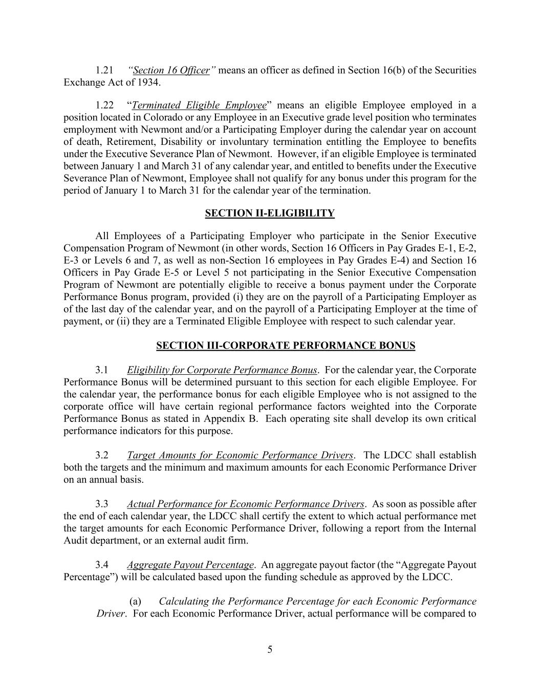 5 1.21 “Section 16 Officer” means an officer as defined in Section 16(b) of the Securities Exchange Act of 1934. 1.22 “Terminated Eligible Employee” means an eligible Employee employed in a position located in Colorado or any Employee in an Executive grade level position who terminates employment with Newmont and/or a Participating Employer during the calendar year on account of death, Retirement, Disability or involuntary termination entitling the Employee to benefits under the Executive Severance Plan of Newmont. However, if an eligible Employee is terminated between January 1 and March 31 of any calendar year, and entitled to benefits under the Executive Severance Plan of Newmont, Employee shall not qualify for any bonus under this program for the period of January 1 to March 31 for the calendar year of the termination. SECTION II-ELIGIBILITY All Employees of a Participating Employer who participate in the Senior Executive Compensation Program of Newmont (in other words, Section 16 Officers in Pay Grades E-1, E-2, E-3 or Levels 6 and 7, as well as non-Section 16 employees in Pay Grades E-4) and Section 16 Officers in Pay Grade E-5 or Level 5 not participating in the Senior Executive Compensation Program of Newmont are potentially eligible to receive a bonus payment under the Corporate Performance Bonus program, provided (i) they are on the payroll of a Participating Employer as of the last day of the calendar year, and on the payroll of a Participating Employer at the time of payment, or (ii) they are a Terminated Eligible Employee with respect to such calendar year. SECTION III-CORPORATE PERFORMANCE BONUS 3.1 Eligibility for Corporate Performance Bonus. For the calendar year, the Corporate Performance Bonus will be determined pursuant to this section for each eligible Employee. For the calendar year, the performance bonus for each eligible Employee who is not assigned to the corporate office will have certain regional performance factors weighted into the Corporate Performance Bonus as stated in Appendix B. Each operating site shall develop its own critical performance indicators for this purpose. 3.2 Target Amounts for Economic Performance Drivers. The LDCC shall establish both the targets and the minimum and maximum amounts for each Economic Performance Driver on an annual basis. 3.3 Actual Performance for Economic Performance Drivers. As soon as possible after the end of each calendar year, the LDCC shall certify the extent to which actual performance met the target amounts for each Economic Performance Driver, following a report from the Internal Audit department, or an external audit firm. 3.4 Aggregate Payout Percentage. An aggregate payout factor (the “Aggregate Payout Percentage”) will be calculated based upon the funding schedule as approved by the LDCC. (a) Calculating the Performance Percentage for each Economic Performance Driver. For each Economic Performance Driver, actual performance will be compared to