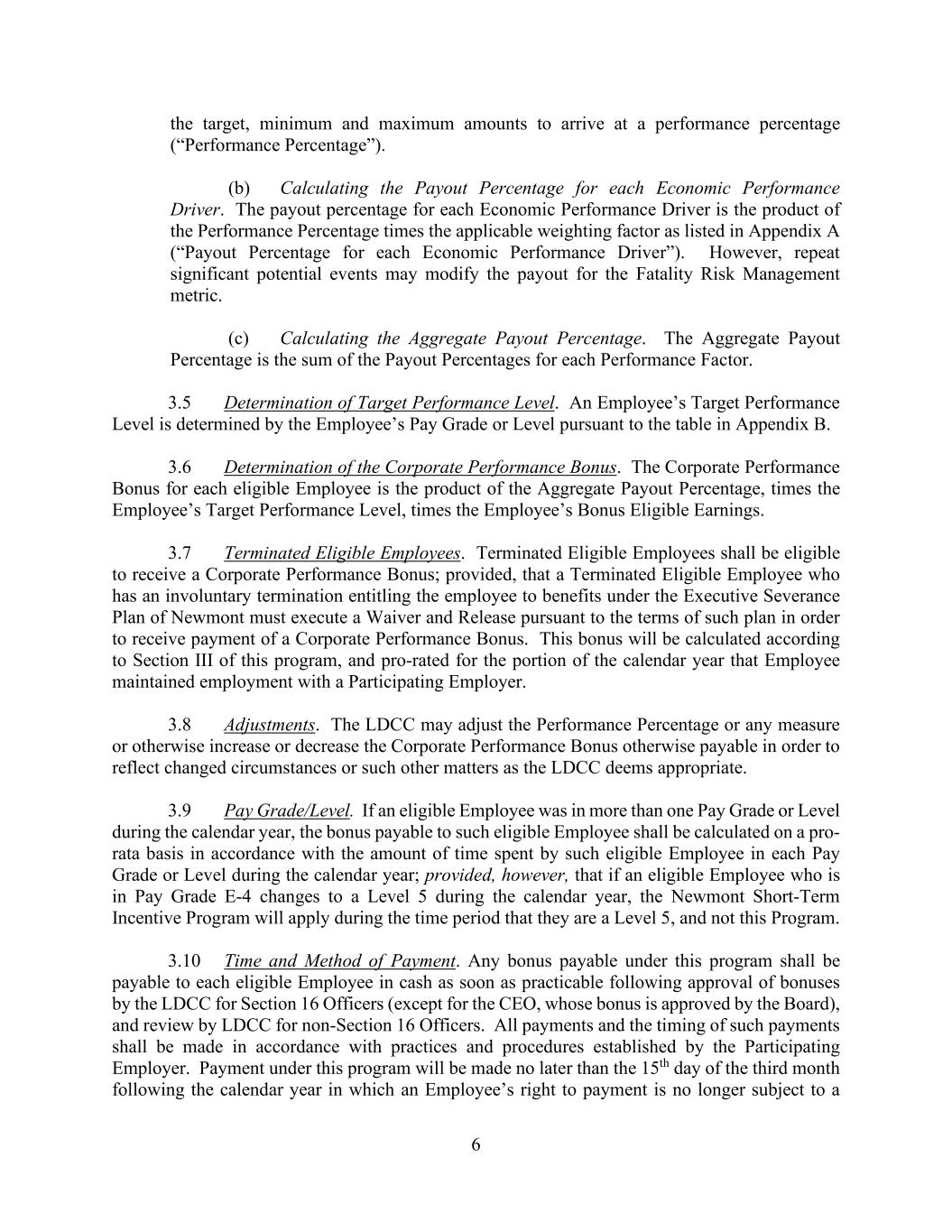 6 the target, minimum and maximum amounts to arrive at a performance percentage (“Performance Percentage”). (b) Calculating the Payout Percentage for each Economic Performance Driver. The payout percentage for each Economic Performance Driver is the product of the Performance Percentage times the applicable weighting factor as listed in Appendix A (“Payout Percentage for each Economic Performance Driver”). However, repeat significant potential events may modify the payout for the Fatality Risk Management metric. (c) Calculating the Aggregate Payout Percentage. The Aggregate Payout Percentage is the sum of the Payout Percentages for each Performance Factor. 3.5 Determination of Target Performance Level. An Employee’s Target Performance Level is determined by the Employee’s Pay Grade or Level pursuant to the table in Appendix B. 3.6 Determination of the Corporate Performance Bonus. The Corporate Performance Bonus for each eligible Employee is the product of the Aggregate Payout Percentage, times the Employee’s Target Performance Level, times the Employee’s Bonus Eligible Earnings. 3.7 Terminated Eligible Employees. Terminated Eligible Employees shall be eligible to receive a Corporate Performance Bonus; provided, that a Terminated Eligible Employee who has an involuntary termination entitling the employee to benefits under the Executive Severance Plan of Newmont must execute a Waiver and Release pursuant to the terms of such plan in order to receive payment of a Corporate Performance Bonus. This bonus will be calculated according to Section III of this program, and pro-rated for the portion of the calendar year that Employee maintained employment with a Participating Employer. 3.8 Adjustments. The LDCC may adjust the Performance Percentage or any measure or otherwise increase or decrease the Corporate Performance Bonus otherwise payable in order to reflect changed circumstances or such other matters as the LDCC deems appropriate. 3.9 Pay Grade/Level. If an eligible Employee was in more than one Pay Grade or Level during the calendar year, the bonus payable to such eligible Employee shall be calculated on a pro- rata basis in accordance with the amount of time spent by such eligible Employee in each Pay Grade or Level during the calendar year; provided, however, that if an eligible Employee who is in Pay Grade E-4 changes to a Level 5 during the calendar year, the Newmont Short-Term Incentive Program will apply during the time period that they are a Level 5, and not this Program. 3.10 Time and Method of Payment. Any bonus payable under this program shall be payable to each eligible Employee in cash as soon as practicable following approval of bonuses by the LDCC for Section 16 Officers (except for the CEO, whose bonus is approved by the Board), and review by LDCC for non-Section 16 Officers. All payments and the timing of such payments shall be made in accordance with practices and procedures established by the Participating Employer. Payment under this program will be made no later than the 15th day of the third month following the calendar year in which an Employee’s right to payment is no longer subject to a