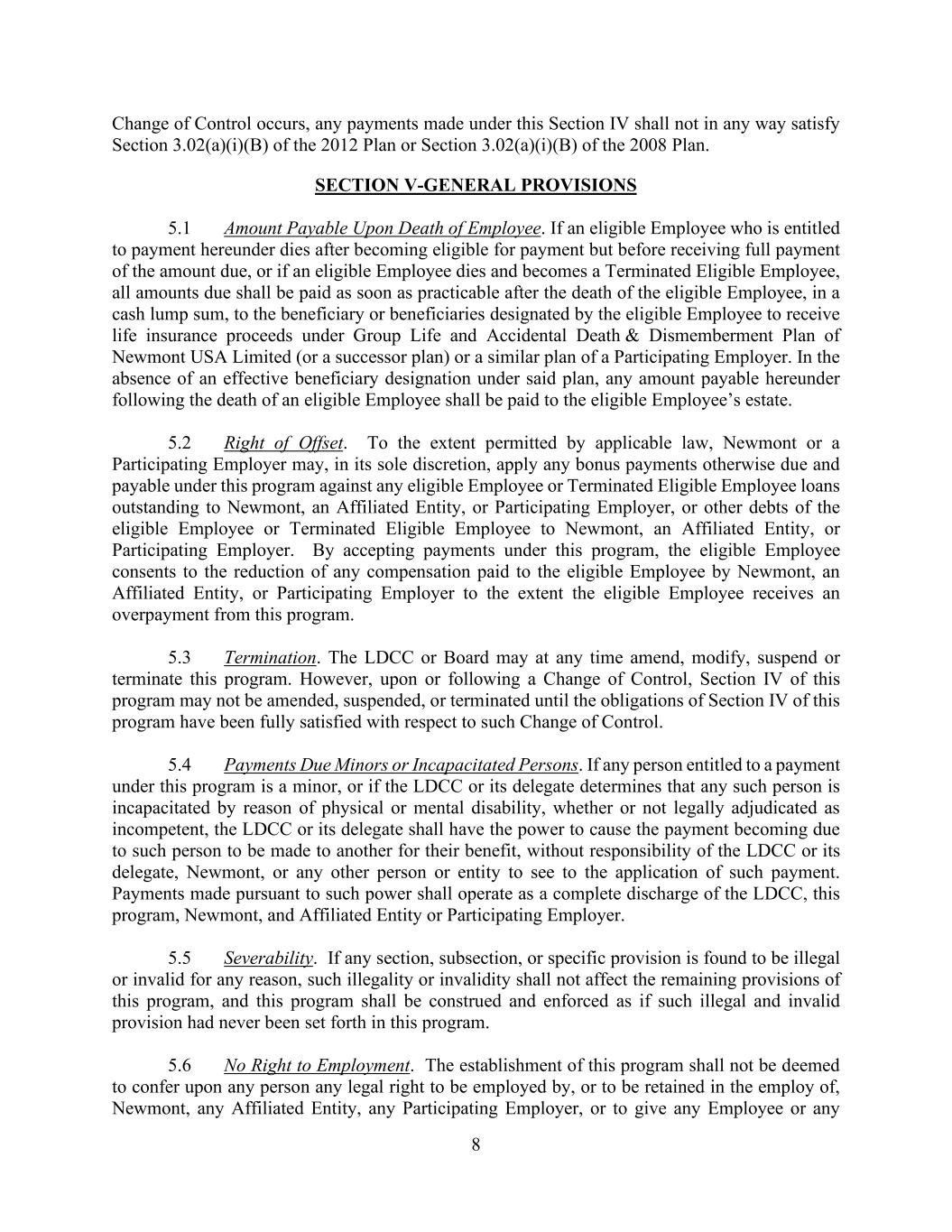 8 Change of Control occurs, any payments made under this Section IV shall not in any way satisfy Section 3.02(a)(i)(B) of the 2012 Plan or Section 3.02(a)(i)(B) of the 2008 Plan. SECTION V-GENERAL PROVISIONS 5.1 Amount Payable Upon Death of Employee. If an eligible Employee who is entitled to payment hereunder dies after becoming eligible for payment but before receiving full payment of the amount due, or if an eligible Employee dies and becomes a Terminated Eligible Employee, all amounts due shall be paid as soon as practicable after the death of the eligible Employee, in a cash lump sum, to the beneficiary or beneficiaries designated by the eligible Employee to receive life insurance proceeds under Group Life and Accidental Death & Dismemberment Plan of Newmont USA Limited (or a successor plan) or a similar plan of a Participating Employer. In the absence of an effective beneficiary designation under said plan, any amount payable hereunder following the death of an eligible Employee shall be paid to the eligible Employee’s estate. 5.2 Right of Offset. To the extent permitted by applicable law, Newmont or a Participating Employer may, in its sole discretion, apply any bonus payments otherwise due and payable under this program against any eligible Employee or Terminated Eligible Employee loans outstanding to Newmont, an Affiliated Entity, or Participating Employer, or other debts of the eligible Employee or Terminated Eligible Employee to Newmont, an Affiliated Entity, or Participating Employer. By accepting payments under this program, the eligible Employee consents to the reduction of any compensation paid to the eligible Employee by Newmont, an Affiliated Entity, or Participating Employer to the extent the eligible Employee receives an overpayment from this program. 5.3 Termination. The LDCC or Board may at any time amend, modify, suspend or terminate this program. However, upon or following a Change of Control, Section IV of this program may not be amended, suspended, or terminated until the obligations of Section IV of this program have been fully satisfied with respect to such Change of Control. 5.4 Payments Due Minors or Incapacitated Persons. If any person entitled to a payment under this program is a minor, or if the LDCC or its delegate determines that any such person is incapacitated by reason of physical or mental disability, whether or not legally adjudicated as incompetent, the LDCC or its delegate shall have the power to cause the payment becoming due to such person to be made to another for their benefit, without responsibility of the LDCC or its delegate, Newmont, or any other person or entity to see to the application of such payment. Payments made pursuant to such power shall operate as a complete discharge of the LDCC, this program, Newmont, and Affiliated Entity or Participating Employer. 5.5 Severability. If any section, subsection, or specific provision is found to be illegal or invalid for any reason, such illegality or invalidity shall not affect the remaining provisions of this program, and this program shall be construed and enforced as if such illegal and invalid provision had never been set forth in this program. 5.6 No Right to Employment. The establishment of this program shall not be deemed to confer upon any person any legal right to be employed by, or to be retained in the employ of, Newmont, any Affiliated Entity, any Participating Employer, or to give any Employee or any