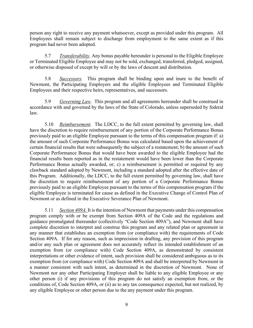 9 person any right to receive any payment whatsoever, except as provided under this program. All Employees shall remain subject to discharge from employment to the same extent as if this program had never been adopted. 5.7 Transferability. Any bonus payable hereunder is personal to the Eligible Employee or Terminated Eligible Employee and may not be sold, exchanged, transferred, pledged, assigned, or otherwise disposed of except by will or by the laws of descent and distribution. 5.8 Successors. This program shall be binding upon and inure to the benefit of Newmont, the Participating Employers and the eligible Employees and Terminated Eligible Employees and their respective heirs, representatives, and successors. 5.9 Governing Law. This program and all agreements hereunder shall be construed in accordance with and governed by the laws of the State of Colorado, unless superseded by federal law. 5.10 Reimbursement. The LDCC, to the full extent permitted by governing law, shall have the discretion to require reimbursement of any portion of the Corporate Performance Bonus previously paid to an eligible Employee pursuant to the terms of this compensation program if: a) the amount of such Corporate Performance Bonus was calculated based upon the achievement of certain financial results that were subsequently the subject of a restatement; b) the amount of such Corporate Performance Bonus that would have been awarded to the eligible Employee had the financial results been reported as in the restatement would have been lower than the Corporate Performance Bonus actually awarded, or; c) a reimbursement is permitted or required by any clawback standard adopted by Newmont, including a standard adopted after the effective date of this Program. Additionally, the LDCC, to the full extent permitted by governing law, shall have the discretion to require reimbursement of any portion of a Corporate Performance Bonus previously paid to an eligible Employee pursuant to the terms of this compensation program if the eligible Employee is terminated for cause as defined in the Executive Change of Control Plan of Newmont or as defined in the Executive Severance Plan of Newmont. 5.11 Section 409A. It is the intention of Newmont that payments under this compensation program comply with or be exempt from Section 409A of the Code and the regulations and guidance promulgated thereunder (collectively “Code Section 409A”), and Newmont shall have complete discretion to interpret and construe this program and any related plan or agreement in any manner that establishes an exemption from (or compliance with) the requirements of Code Section 409A. If for any reason, such as imprecision in drafting, any provision of this program and/or any such plan or agreement does not accurately reflect its intended establishment of an exemption from (or compliance with) Code Section 409A, as demonstrated by consistent interpretations or other evidence of intent, such provision shall be considered ambiguous as to its exemption from (or compliance with) Code Section 409A and shall be interpreted by Newmont in a manner consistent with such intent, as determined in the discretion of Newmont. None of Newmont nor any other Participating Employer shall be liable to any eligible Employee or any other person (i) if any provisions of this program do not satisfy an exemption from, or the conditions of, Code Section 409A, or (ii) as to any tax consequence expected, but not realized, by any eligible Employee or other person due to the any payment under this program.