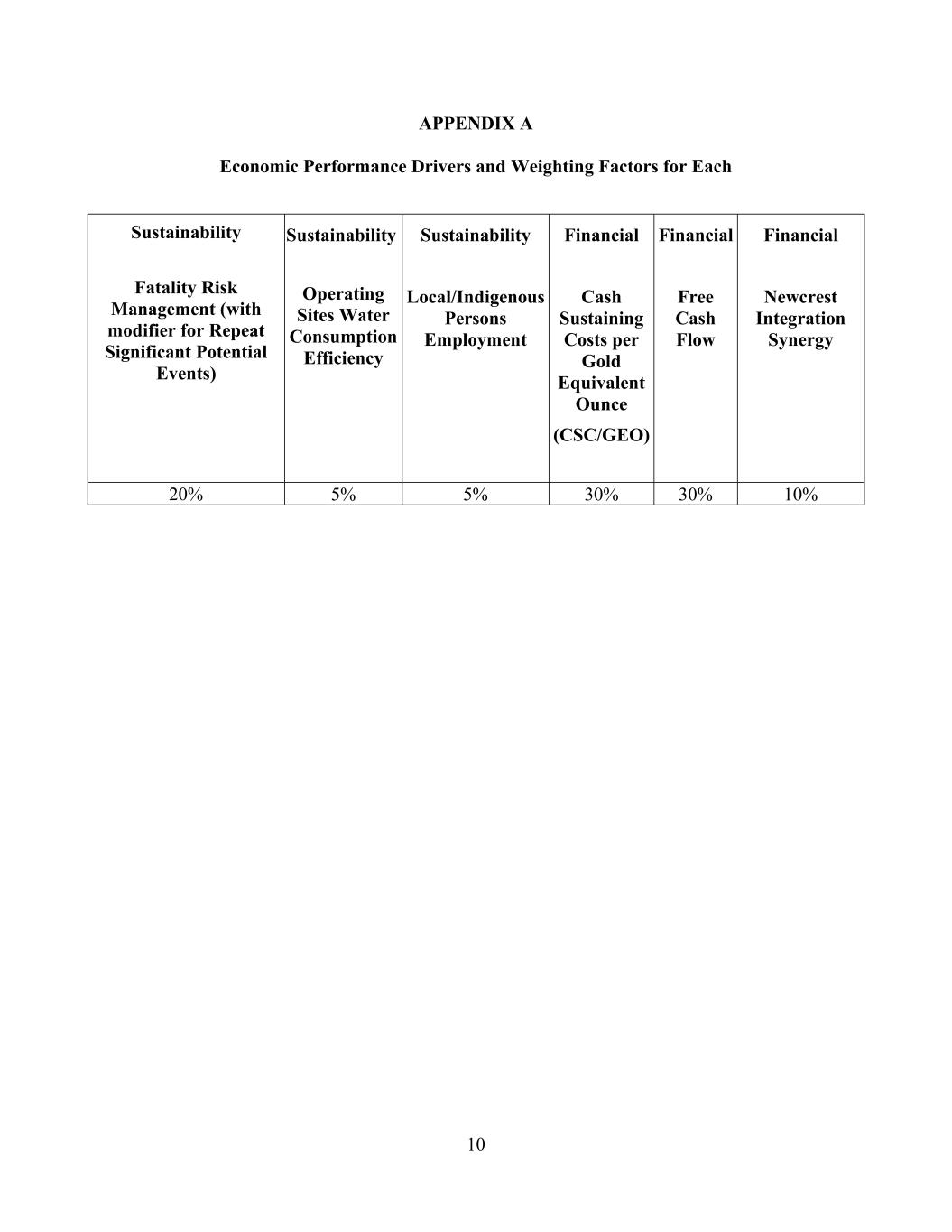 10 APPENDIX A Economic Performance Drivers and Weighting Factors for Each Sustainability Fatality Risk Management (with modifier for Repeat Significant Potential Events) Sustainability Operating Sites Water Consumption Efficiency Sustainability Local/Indigenous Persons Employment Financial Cash Sustaining Costs per Gold Equivalent Ounce (CSC/GEO) Financial Free Cash Flow Financial Newcrest Integration Synergy 20% 5% 5% 30% 30% 10%