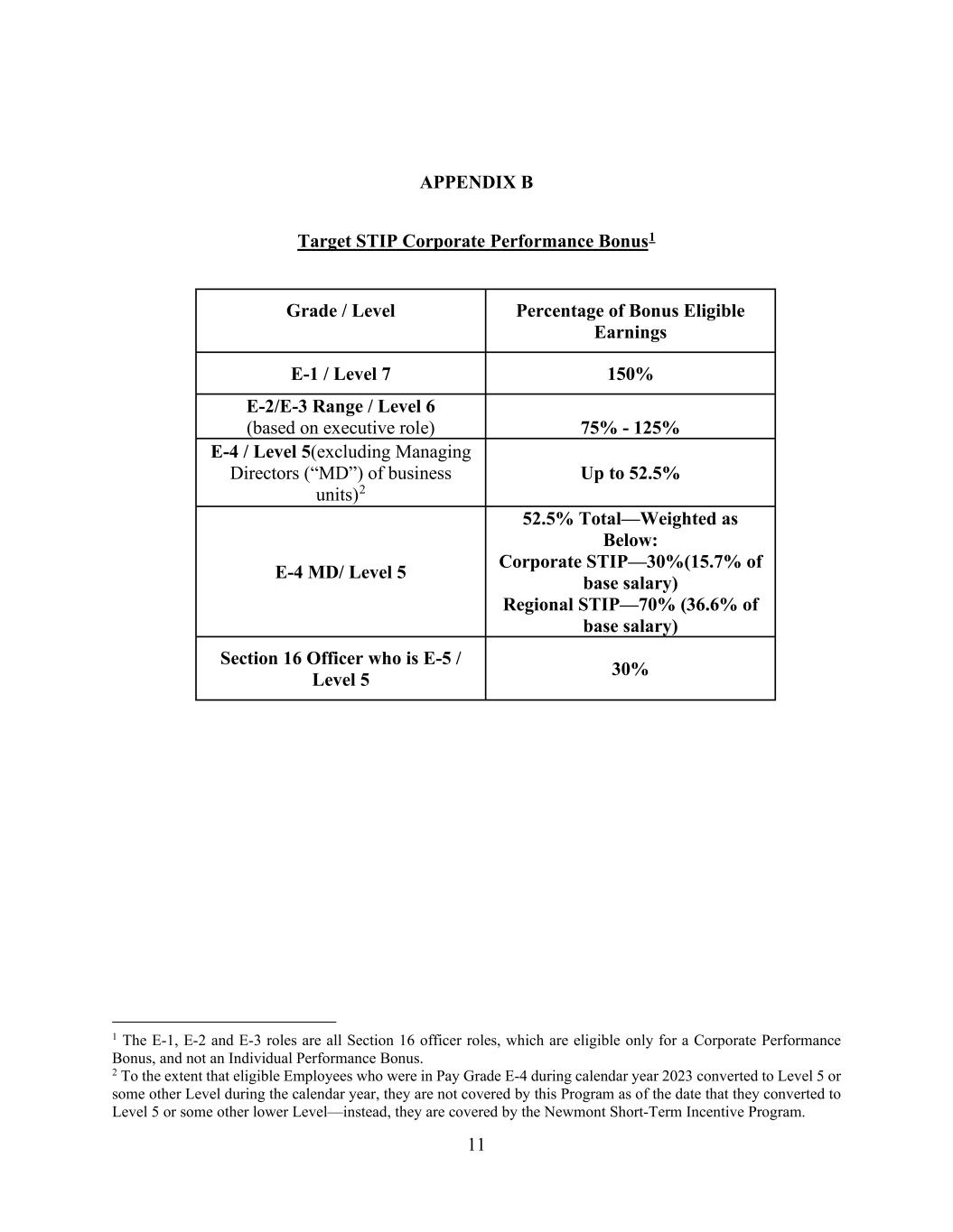11 APPENDIX B Target STIP Corporate Performance Bonus1 Grade / Level Percentage of Bonus Eligible Earnings E-1 / Level 7 150% E-2/E-3 Range / Level 6 (based on executive role) 75% - 125% E-4 / Level 5(excluding Managing Directors (“MD”) of business units)2 Up to 52.5% E-4 MD/ Level 5 52.5% Total—Weighted as Below: Corporate STIP—30%(15.7% of base salary) Regional STIP—70% (36.6% of base salary) Section 16 Officer who is E-5 / Level 5 30% 1 The E-1, E-2 and E-3 roles are all Section 16 officer roles, which are eligible only for a Corporate Performance Bonus, and not an Individual Performance Bonus. 2 To the extent that eligible Employees who were in Pay Grade E-4 during calendar year 2023 converted to Level 5 or some other Level during the calendar year, they are not covered by this Program as of the date that they converted to Level 5 or some other lower Level—instead, they are covered by the Newmont Short-Term Incentive Program.