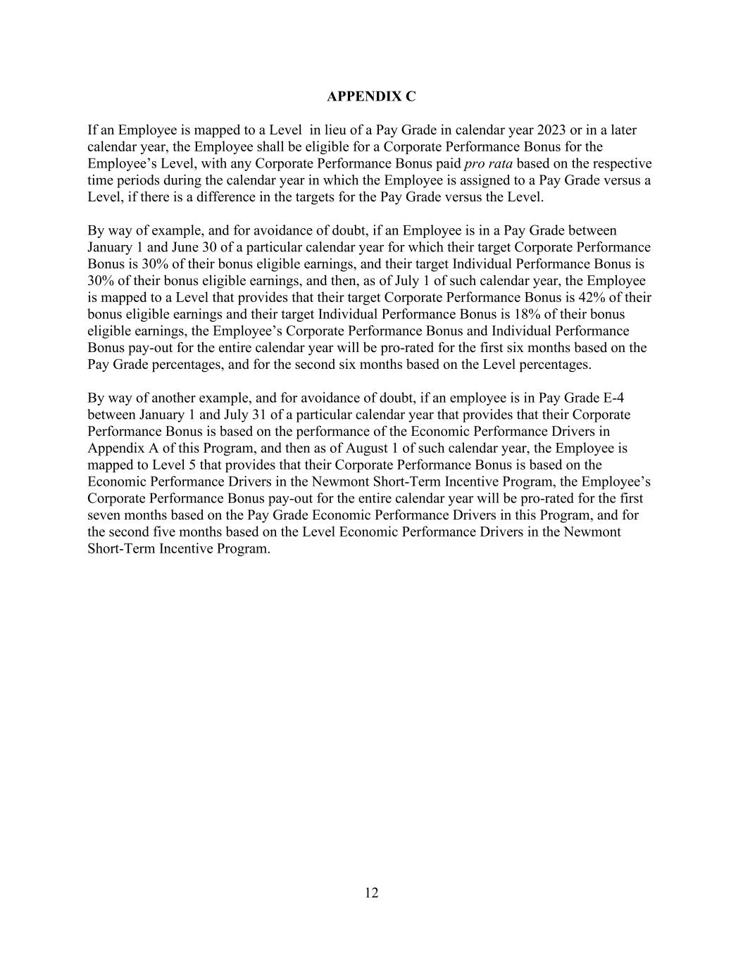 12 APPENDIX C If an Employee is mapped to a Level in lieu of a Pay Grade in calendar year 2023 or in a later calendar year, the Employee shall be eligible for a Corporate Performance Bonus for the Employee’s Level, with any Corporate Performance Bonus paid pro rata based on the respective time periods during the calendar year in which the Employee is assigned to a Pay Grade versus a Level, if there is a difference in the targets for the Pay Grade versus the Level. By way of example, and for avoidance of doubt, if an Employee is in a Pay Grade between January 1 and June 30 of a particular calendar year for which their target Corporate Performance Bonus is 30% of their bonus eligible earnings, and their target Individual Performance Bonus is 30% of their bonus eligible earnings, and then, as of July 1 of such calendar year, the Employee is mapped to a Level that provides that their target Corporate Performance Bonus is 42% of their bonus eligible earnings and their target Individual Performance Bonus is 18% of their bonus eligible earnings, the Employee’s Corporate Performance Bonus and Individual Performance Bonus pay-out for the entire calendar year will be pro-rated for the first six months based on the Pay Grade percentages, and for the second six months based on the Level percentages. By way of another example, and for avoidance of doubt, if an employee is in Pay Grade E-4 between January 1 and July 31 of a particular calendar year that provides that their Corporate Performance Bonus is based on the performance of the Economic Performance Drivers in Appendix A of this Program, and then as of August 1 of such calendar year, the Employee is mapped to Level 5 that provides that their Corporate Performance Bonus is based on the Economic Performance Drivers in the Newmont Short-Term Incentive Program, the Employee’s Corporate Performance Bonus pay-out for the entire calendar year will be pro-rated for the first seven months based on the Pay Grade Economic Performance Drivers in this Program, and for the second five months based on the Level Economic Performance Drivers in the Newmont Short-Term Incentive Program.