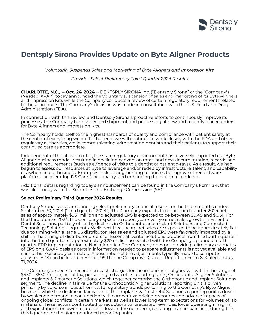 Dentsply Sirona Provides Update on Byte Aligner Products Voluntarily Suspends Sales and Marketing of Byte Aligners and Impression Kits Provides Select Preliminary Third Quarter 2024 Results CHARLOTTE, N.C., -- Oct. 24, 2024 -- DENTSPLY SIRONA Inc. (“Dentsply Sirona” or the "Company") (Nasdaq: XRAY), today announced the voluntary suspension of sales and marketing of its Byte Aligners and Impression Kits while the Company conducts a review of certain regulatory requirements related to these products. The Company’s decision was made in consultation with the U.S. Food and Drug Administration (FDA). In connection with this review, and Dentsply Sirona’s proactive efforts to continuously improve its processes, the Company has suspended shipment and processing of new and recently placed orders for Byte Aligners and Impression Kits. The Company holds itself to the highest standards of quality and compliance with patient safety at the center of everything we do. To that end, we will continue to work closely with the FDA and other regulatory authorities, while communicating with treating dentists and their patients to support their continued care as appropriate. Independent of the above matter, the state regulatory environment has adversely impacted our Byte Aligner business model, resulting in declining conversion rates, and new documentation, records and additional requirements (such as evidence of visits to a dentist or patient x-rays). As a result, we had begun to assess our resources at Byte to leverage and/or redeploy infrastructure, talent, and capability elsewhere in our business. Examples include augmenting resources to improve other software platforms, accelerating DS Core functionality, and enhancing the patient experience. Additional details regarding today’s announcement can be found in the Company’s Form 8-K that was filed today with the Securities and Exchange Commission (SEC). Select Preliminary Third Quarter 2024 Results Dentsply Sirona is also announcing select preliminary financial results for the three months ended September 30, 2024 (“third quarter 2024”). The Company expects to report third quarter 2024 net sales of approximately $951 million and adjusted EPS is expected to be between $0.49 and $0.51. For the third quarter 2024, the Company expects to report year-over-year net sales growth in Essential Dental Solutions, partially offset by declines in Orthodontic and Implant Solutions and Connected Technology Solutions segments. Wellspect Healthcare net sales are expected to be approximately flat due to timing with a large US distributor. Net sales and adjusted EPS were favorably impacted by a shift in the timing of distributor orders for Essential Dental Solutions products from the fourth quarter into the third quarter of approximately $20 million associated with the Company’s planned fourth quarter ERP implementation in North America. The Company does not provide preliminary estimates of EPS on a GAAP basis as certain information needed to prepare adjustments is not yet available and cannot be reasonably estimated. A description of the adjustments typically made to compute adjusted EPS can be found in Exhibit 99.1 to the Company’s Current Report on Form 8-K filed on July 31, 2024. The Company expects to record non-cash charges for the impairment of goodwill within the range of $450 - $550 million, net of tax, pertaining to two of its reporting units, Orthodontic Aligner Solutions and Implants & Prosthetic Solutions, which together comprise the Orthodontic and Implant Solutions segment. The decline in fair value for the Orthodontic Aligner Solutions reporting unit is driven primarily by adverse impacts from state regulatory trends pertaining to the Company’s Byte Aligner business, while the decline in fair value for the Implants & Prosthetic Solutions reporting unit is driven by weakened demand in conjunction with competitive pricing pressures and adverse impacts of ongoing global conflicts in certain markets, as well as lower long-term expectations for volumes of lab materials. These factors contributed to reductions to forecasted revenues, lower operating margins, and expectations for lower future cash flows in the near term, resulting in an impairment during the third quarter for the aforementioned reporting units.