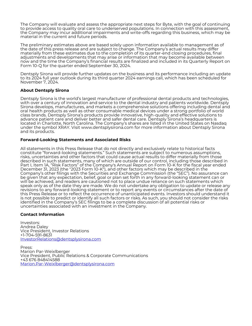 The Company will evaluate and assess the appropriate next steps for Byte, with the goal of continuing to provide access to quality oral care to underserved populations. In connection with this assessment, the Company may incur additional impairments and write-offs regarding this business, which may be material in the current and future periods. The preliminary estimates above are based solely upon information available to management as of the date of this press release and are subject to change. The Company’s actual results may differ materially from these estimates due to the completion of its quarter-end closing procedures, final adjustments and developments that may arise or information that may become available between now and the time the Company’s financial results are finalized and included in its Quarterly Report on Form 10-Q for the quarter ended September 30, 2024. Dentsply Sirona will provide further updates on the business and its performance including an update to its 2024 full year outlook during its third quarter 2024 earnings call, which has been scheduled for November 7, 2024. About Dentsply Sirona Dentsply Sirona is the world’s largest manufacturer of professional dental products and technologies, with over a century of innovation and service to the dental industry and patients worldwide. Dentsply Sirona develops, manufactures, and markets a comprehensive solutions offering including dental and oral health products as well as other consumable medical devices under a strong portfolio of world class brands. Dentsply Sirona’s products provide innovative, high-quality and effective solutions to advance patient care and deliver better and safer dental care. Dentsply Sirona’s headquarters is located in Charlotte, North Carolina. The Company’s shares are listed in the United States on Nasdaq under the symbol XRAY. Visit www.dentsplysirona.com for more information about Dentsply Sirona and its products. Forward-Looking Statements and Associated Risks All statements in this Press Release that do not directly and exclusively relate to historical facts constitute “forward-looking statements.” Such statements are subject to numerous assumptions, risks, uncertainties and other factors that could cause actual results to differ materially from those described in such statements, many of which are outside of our control, including those described in Part I, Item 1A, “Risk Factors” of the Company's Annual Report on Form 10-K for the fiscal year ended December 31, 2023 (the "2023 Form 10-K"), and other factors which may be described in the Company’s other filings with the Securities and Exchange Commission (the “SEC”). No assurance can be given that any expectation, belief, goal or plan set forth in any forward-looking statement can or will be achieved, and readers are cautioned not to place undue reliance on such statements which speak only as of the date they are made. We do not undertake any obligation to update or release any revisions to any forward-looking statement or to report any events or circumstances after the date of this Press Release or to reflect the occurrence of unanticipated events. Investors should understand it is not possible to predict or identify all such factors or risks. As such, you should not consider the risks identified in the Company’s SEC filings to be a complete discussion of all potential risks or uncertainties associated with an investment in the Company. Contact Information Investors: Andrea Daley Vice President, Investor Relations +1-704-591-8631 InvestorRelations@dentsplysirona.com Press: Marion Par-Weixlberger Vice President, Public Relations & Corporate Communications +43 676 848414588 Marion.Par-Weixlberger@dentsplysirona.com