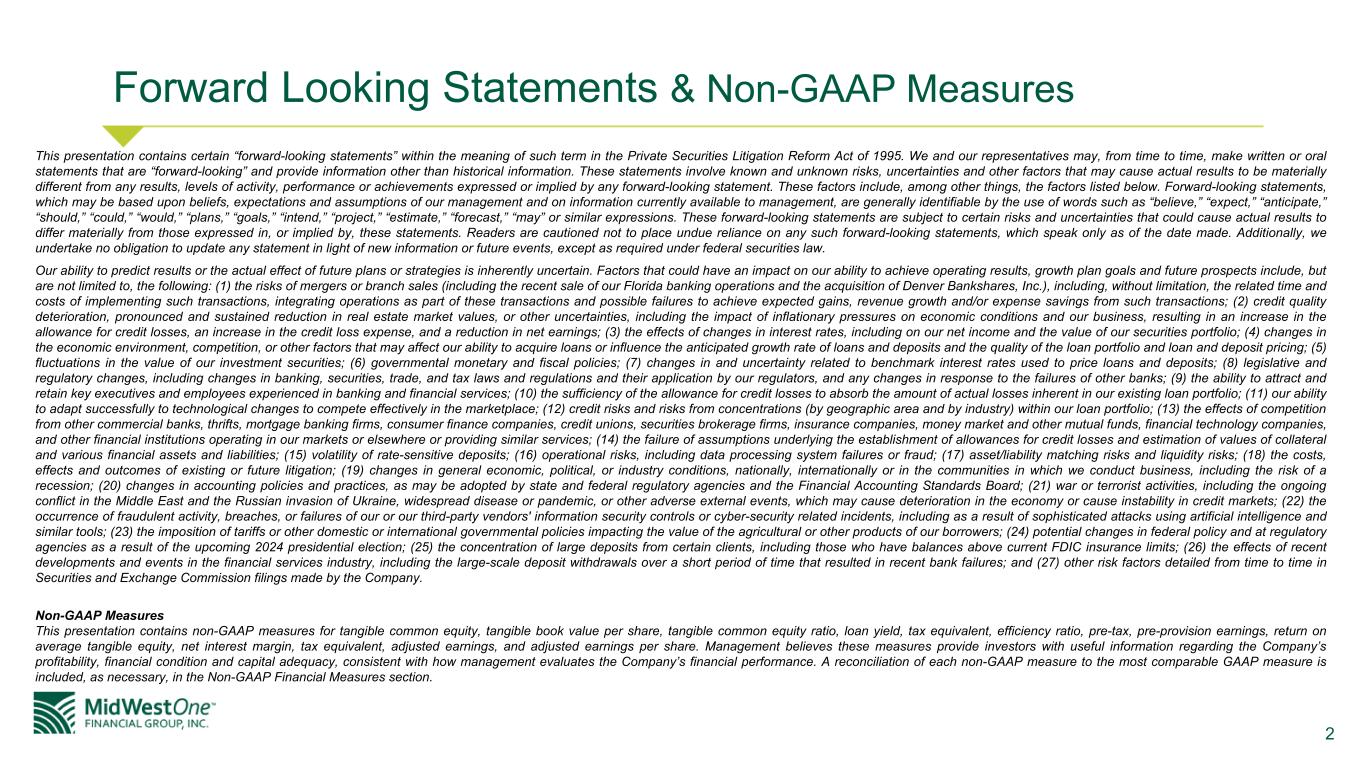 2 Forward Looking Statements & Non-GAAP Measures This presentation contains certain “forward-looking statements” within the meaning of such term in the Private Securities Litigation Reform Act of 1995. We and our representatives may, from time to time, make written or oral statements that are “forward-looking” and provide information other than historical information. These statements involve known and unknown risks, uncertainties and other factors that may cause actual results to be materially different from any results, levels of activity, performance or achievements expressed or implied by any forward-looking statement. These factors include, among other things, the factors listed below. Forward-looking statements, which may be based upon beliefs, expectations and assumptions of our management and on information currently available to management, are generally identifiable by the use of words such as “believe,” “expect,” “anticipate,” “should,” “could,” “would,” “plans,” “goals,” “intend,” “project,” “estimate,” “forecast,” “may” or similar expressions. These forward-looking statements are subject to certain risks and uncertainties that could cause actual results to differ materially from those expressed in, or implied by, these statements. Readers are cautioned not to place undue reliance on any such forward-looking statements, which speak only as of the date made. Additionally, we undertake no obligation to update any statement in light of new information or future events, except as required under federal securities law. Our ability to predict results or the actual effect of future plans or strategies is inherently uncertain. Factors that could have an impact on our ability to achieve operating results, growth plan goals and future prospects include, but are not limited to, the following: (1) the risks of mergers or branch sales (including the recent sale of our Florida banking operations and the acquisition of Denver Bankshares, Inc.), including, without limitation, the related time and costs of implementing such transactions, integrating operations as part of these transactions and possible failures to achieve expected gains, revenue growth and/or expense savings from such transactions; (2) credit quality deterioration, pronounced and sustained reduction in real estate market values, or other uncertainties, including the impact of inflationary pressures on economic conditions and our business, resulting in an increase in the allowance for credit losses, an increase in the credit loss expense, and a reduction in net earnings; (3) the effects of changes in interest rates, including on our net income and the value of our securities portfolio; (4) changes in the economic environment, competition, or other factors that may affect our ability to acquire loans or influence the anticipated growth rate of loans and deposits and the quality of the loan portfolio and loan and deposit pricing; (5) fluctuations in the value of our investment securities; (6) governmental monetary and fiscal policies; (7) changes in and uncertainty related to benchmark interest rates used to price loans and deposits; (8) legislative and regulatory changes, including changes in banking, securities, trade, and tax laws and regulations and their application by our regulators, and any changes in response to the failures of other banks; (9) the ability to attract and retain key executives and employees experienced in banking and financial services; (10) the sufficiency of the allowance for credit losses to absorb the amount of actual losses inherent in our existing loan portfolio; (11) our ability to adapt successfully to technological changes to compete effectively in the marketplace; (12) credit risks and risks from concentrations (by geographic area and by industry) within our loan portfolio; (13) the effects of competition from other commercial banks, thrifts, mortgage banking firms, consumer finance companies, credit unions, securities brokerage firms, insurance companies, money market and other mutual funds, financial technology companies, and other financial institutions operating in our markets or elsewhere or providing similar services; (14) the failure of assumptions underlying the establishment of allowances for credit losses and estimation of values of collateral and various financial assets and liabilities; (15) volatility of rate-sensitive deposits; (16) operational risks, including data processing system failures or fraud; (17) asset/liability matching risks and liquidity risks; (18) the costs, effects and outcomes of existing or future litigation; (19) changes in general economic, political, or industry conditions, nationally, internationally or in the communities in which we conduct business, including the risk of a recession; (20) changes in accounting policies and practices, as may be adopted by state and federal regulatory agencies and the Financial Accounting Standards Board; (21) war or terrorist activities, including the ongoing conflict in the Middle East and the Russian invasion of Ukraine, widespread disease or pandemic, or other adverse external events, which may cause deterioration in the economy or cause instability in credit markets; (22) the occurrence of fraudulent activity, breaches, or failures of our or our third-party vendors' information security controls or cyber-security related incidents, including as a result of sophisticated attacks using artificial intelligence and similar tools; (23) the imposition of tariffs or other domestic or international governmental policies impacting the value of the agricultural or other products of our borrowers; (24) potential changes in federal policy and at regulatory agencies as a result of the upcoming 2024 presidential election; (25) the concentration of large deposits from certain clients, including those who have balances above current FDIC insurance limits; (26) the effects of re