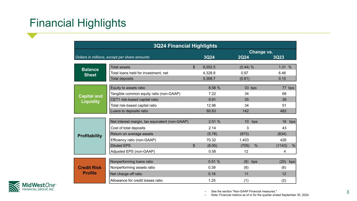 2 Forward Looking Statements & Non-GAAP Measures This presentation contains certain “forward-looking statements” within the meaning of such term in the Private Securities Litigation Reform Act of 1995. We and our representatives may, from time to time, make written or oral statements that are “forward-looking” and provide information other than historical information. These statements involve known and unknown risks, uncertainties and other factors that may cause actual results to be materially different from any results, levels of activity, performance or achievements expressed or implied by any forward-looking statement. These factors include, among other things, the factors listed below. Forward-looking statements, which may be based upon beliefs, expectations and assumptions of our management and on information currently available to management, are generally identifiable by the use of words such as “believe,” “expect,” “anticipate,” “should,” “could,” “would,” “plans,” “goals,” “intend,” “project,” “estimate,” “forecast,” “may” or similar expressions. These forward-looking statements are subject to certain risks and uncertainties that could cause actual results to differ materially from those expressed in, or implied by, these statements. Readers are cautioned not to place undue reliance on any such forward-looking statements, which speak only as of the date made. Additionally, we undertake no obligation to update any statement in light of new information or future events, except as required under federal securities law. Our ability to predict results or the actual effect of future plans or strategies is inherently uncertain. Factors that could have an impact on our ability to achieve operating results, growth plan goals and future prospects include, but are not limited to, the following: (1) the risks of mergers or branch sales (including the recent sale of our Florida banking operations and the acquisition of Denver Bankshares, Inc.), including, without limitation, the related time and costs of implementing such transactions, integrating operations as part of these transactions and possible failures to achieve expected gains, revenue growth and/or expense savings from such transactions; (2) credit quality deterioration, pronounced and sustained reduction in real estate market values, or other uncertainties, including the impact of inflationary pressures on economic conditions and our business, resulting in an increase in the allowance for credit losses, an increase in the credit loss expense, and a reduction in net earnings; (3) the effects of changes in interest rates, including on our net income and the value of our securities portfolio; (4) changes in the economic environment, competition, or other factors that may affect our ability to acquire loans or influence the anticipated growth rate of loans and deposits and the quality of the loan portfolio and loan and deposit pricing; (5) fluctuations in the value of our investment securities; (6) governmental monetary and fiscal policies; (7) changes in and uncertainty related to benchmark interest rates used to price loans and deposits; (8) legislative and regulatory changes, including changes in banking, securities, trade, and tax laws and regulations and their application by our regulators, and any changes in response to the failures of other banks; (9) the ability to attract and retain key executives and employees experienced in banking and financial services; (10) the sufficiency of the allowance for credit losses to absorb the amount of actual losses inherent in our existing loan portfolio; (11) our ability to adapt successfully to technological changes to compete effectively in the marketplace; (12) credit risks and risks from concentrations (by geographic area and by industry) within our loan portfolio; (13) the effects of competition from other commercial banks, thrifts, mortgage banking firms, consumer finance companies, credit unions, securities brokerage firms, insurance companies, money market and other mutual funds, financial technology companies, and other financial institutions operating in our markets or elsewhere or providing similar services; (14) the failure of assumptions underlying the establishment of allowances for credit losses and estimation of values of collateral and various financial assets and liabilities; (15) volatility of rate-sensitive deposits; (16) operational risks, including data processing system failures or fraud; (17) asset/liability matching risks and liquidity risks; (18) the costs, effects and outcomes of existing or future litigation; (19) changes in general economic, political, or industry conditions, nationally, internationally or in the communities in which we conduct business, including the risk of a recession; (20) changes in accounting policies and practices, as may be adopted by state and federal regulatory agencies and the Financial Accounting Standards Board; (21) war or terrorist activities, including the ongoing conflict in the Middle East and the Russian invasion of Ukraine, widespread disease or pandemic, or other adverse external events, which may cause deterioration in the economy or cause instability in credit markets; (22) the occurrence of fraudulent activity, breaches, or failures of our or our third-party vendors' information security controls or cyber-security related incidents, including as a result of sophisticated attacks using artificial intelligence and similar tools; (23) the imposition of tariffs or other domestic or international governmental policies impacting the value of the agricultural or other products of our borrowers; (24) potential changes in federal policy and at regulatory agencies as a result of the upcoming 2024 presidential election; (25) the concentration of large deposits from certain clients, including those who have balances above current FDIC insurance limits; (26) the effects of re
