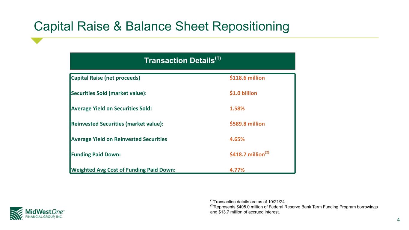 •Completed a common equity capital raise, resulting in net proceeds to the Company of $118.6 million to facilitate a balance sheet repositioning. $140.4 million of securities impairment related to the repositioning was recognized in pre-tax earnings.