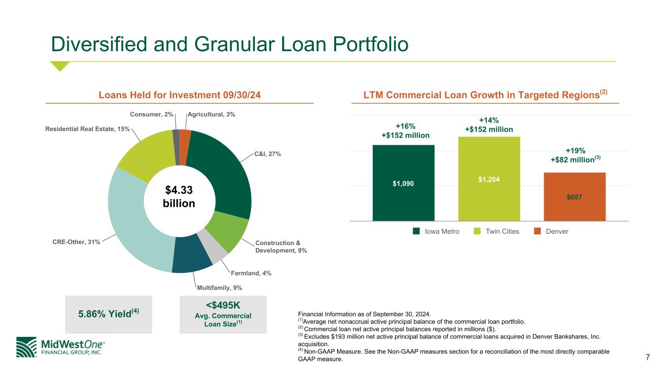 6 What We Have Accomplished Strategic Plan Updates Geographic Realignment Sale of Florida branches (7.5% deposit premium) and Acquisition of Bank of Denver in first half of 2024 ☑ Talent Transformation Robust talent acquisition strategy installing senior leaders, product management, IT resources and revenue producers across target markets ☑ Operational Efficiency Completed a common equity capital raise during the third quarter of 2024, with proceeds used to support a balance sheet repositioning executed early in the fourth quarter of 2024 ☑ Wealth Continued momentum in Wealth Management, with year-to-date revenue growth of 15% compared to the prior year (through third quarter) ☑ Commercial Growth Annualized commercial & industrial ("C&I") and commercial real estate ("CRE") loan growth was 11% and 3%, respectively, for the third quarter of 2024 ☑