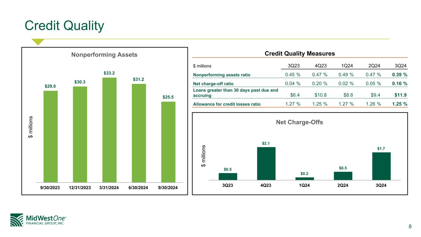 7 Diversified and Granular Loan Portfolio Loans Held for Investment 09/30/24 Agricultural, 3% C&I, 27% Construction & Development, 9% Farmland, 4% Multifamily, 9% CRE-Other, 31% Residential Real Estate, 15% Consumer, 2% $4.33 billion 5.86% Yield(4) <$495K Avg. Commercial Loan Size(1) Financial Information as of September 30, 2024. (1)Average net nonaccrual active principal balance of the commercial loan portfolio. (2) Commercial loan net active principal balances reported in millions ($). (3) Excludes $193 million net active principal balance of commercial loans acquired in Denver Bankshares, Inc. acquisition. (4) Non-GAAP Measure. See the Non-GAAP measures section for a reconciliation of the most directly comparable GAAP measure. $1,090 $1,204 $697 Iowa Metro Twin Cities Denver LTM Commercial Loan Growth in Targeted Regions(2) +16% +$152 million +14% +$152 million +19% +$82 million(3)