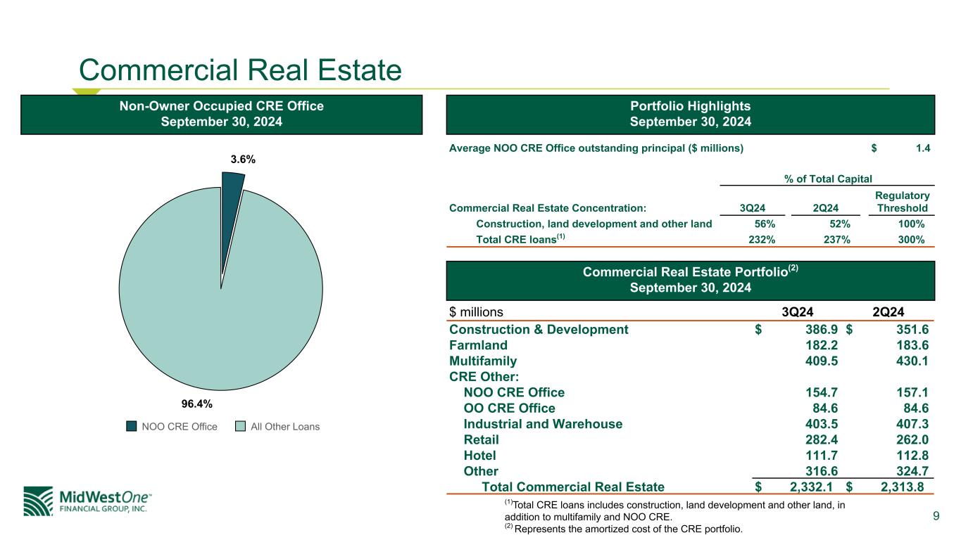 8 Credit Quality $ m illi on s Nonperforming Assets $29.0 $30.3 $33.2 $31.2 $25.5 9/30/2023 12/31/2023 3/31/2024 6/30/2024 9/30/2024 $ m illi on s Net Charge-Offs $0.5 $2.1 $0.2 $0.5 $1.7 3Q23 4Q23 1Q24 2Q24 3Q24 Credit Quality Measures $ millions 3Q23 4Q23 1Q24 2Q24 3Q24 Nonperforming assets ratio 0.45 % 0.47 % 0.49 % 0.47 % 0.39 % Net charge-off ratio 0.04 % 0.20 % 0.02 % 0.05 % 0.16 % Loans greater than 30 days past due and accruing $6.4 $10.8 $8.8 $9.4 $11.9 Allowance for credit losses ratio 1.27 % 1.25 % 1.27 % 1.26 % 1.25 %