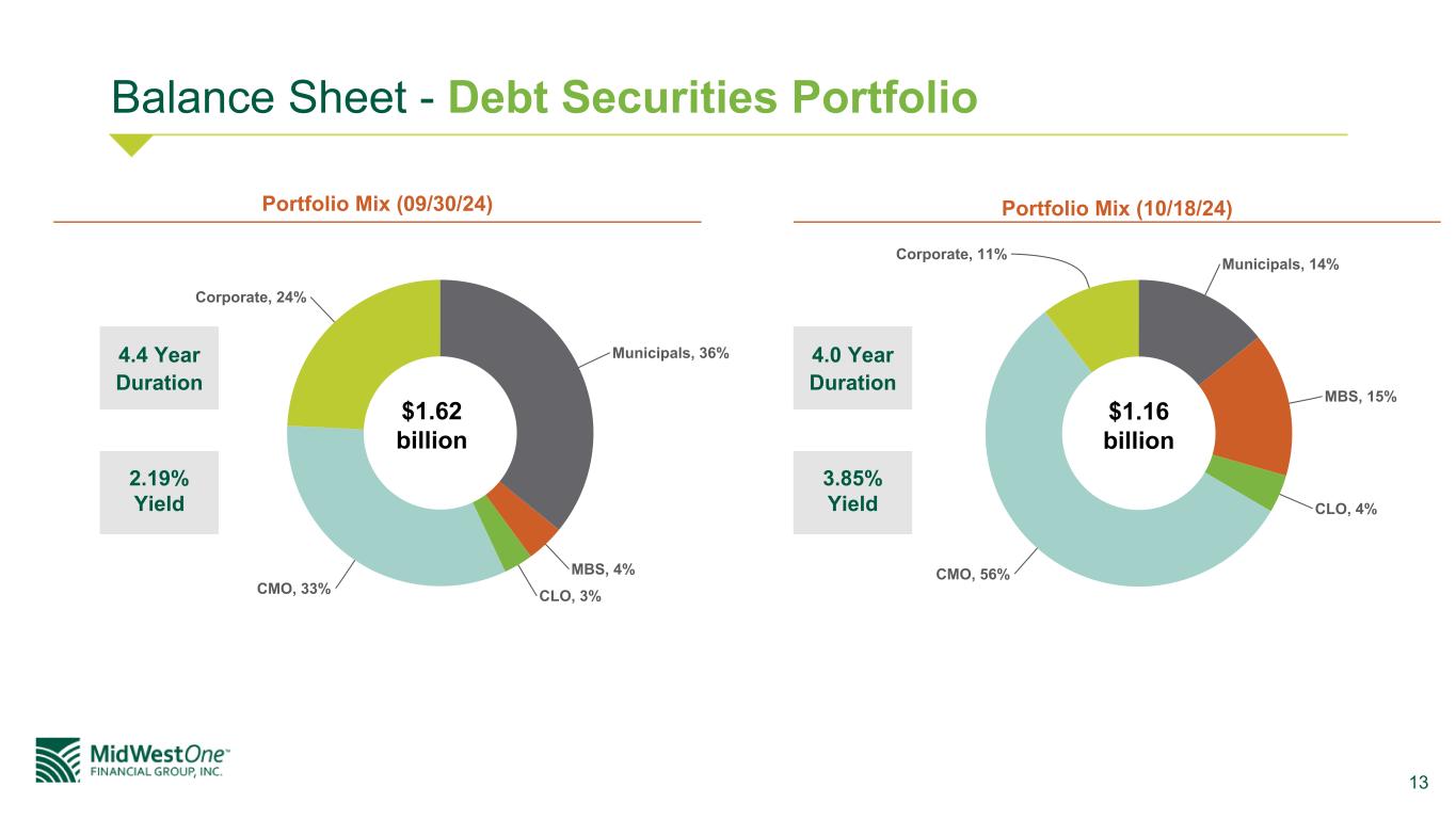 12 Balance Sheet 3Q24 vs. 2Q24 3Q24 vs. 3Q23 Period end balances, $ millions 3Q24 $ Change % Change $ Change % Change Loans $4,328.8 $41.6 1 % $262.8 6 % Investment securities $1,623.1 $(201.0) (11) % $(335.4) (17) % Interest earning deposits in banks $129.7 $94.4 267 % $125.9 3313 % Deposits $5,368.7 $(43.7) (1) % $5.4 — % Borrowed funds $525.7 $(3.8) (1) % $27.2 5 % Shareholders' equity $562.2 $18.9 3 % $56.8 11 % 3Q24 3Q24 Period end 3Q24 2Q24 vs. 2Q24 3Q23 vs. 3Q23 Tangible book value per share (non-GAAP) $22.43 $28.27 (21) % $26.60 (16) % Common equity Tier 1 capital ratio 9.91 % 9.56 % 35 bps 9.52 % 39 bps AOCI $(58.8) $(58.1) (1) % $(84.6) 30 % Return on average tangible equity (non-GAAP) (82.78) % 15.74 % (9,852) bps 9.68 % (9,246) bps – See the section "Non-GAAP Financial Measures."