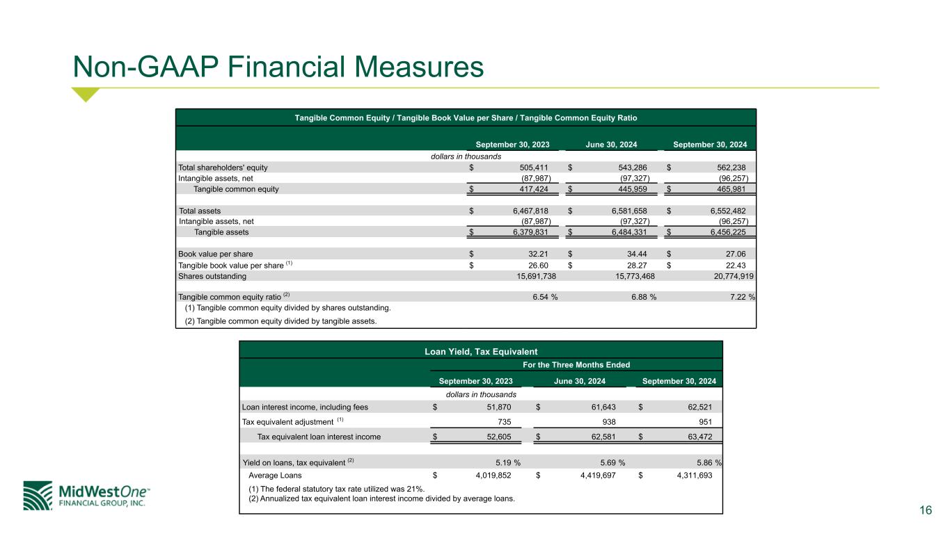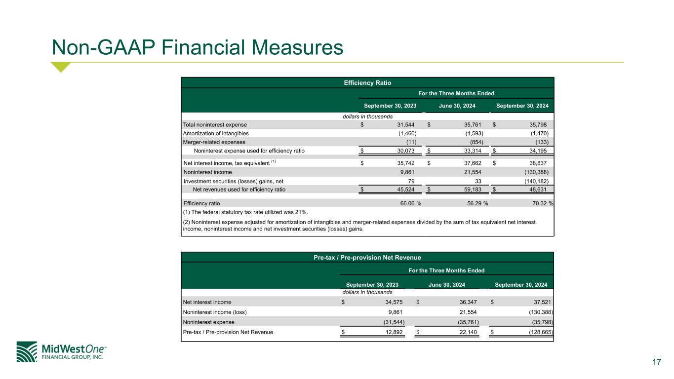 16 Non-GAAP Financial Measures Tangible Common Equity / Tangible Book Value per Share / Tangible Common Equity Ratio September 30, 2023 June 30, 2024 September 30, 2024 dollars in thousands Total shareholders' equity $ 505,411 $ 543,286 $ 562,238 Intangible assets, net (87,987) (97,327) (96,257) Tangible common equity $ 417,424 $ 445,959 $ 465,981 Total assets $ 6,467,818 $ 6,581,658 $ 6,552,482 Intangible assets, net (87,987) (97,327) (96,257) Tangible assets $ 6,379,831 $ 6,484,331 $ 6,456,225 Book value per share $ 32.21 $ 34.44 $ 27.06 Tangible book value per share (1) $ 26.60 $ 28.27 $ 22.43 Shares outstanding 15,691,738 15,773,468 20,774,919 Tangible common equity ratio (2) 6.54 % 6.88 % 7.22 % (1) Tangible common equity divided by shares outstanding. (2) Tangible common equity divided by tangible assets. Loan Yield, Tax Equivalent For the Three Months Ended September 30, 2023 June 30, 2024 September 30, 2024 dollars in thousands Loan interest income, including fees $ 51,870 $ 61,643 $ 62,521 Tax equivalent adjustment (1) 735 938 951 Tax equivalent loan interest income $ 52,605 $ 62,581 $ 63,472 Yield on loans, tax equivalent (2) 5.19 % 5.69 % 5.86 % Average Loans $ 4,019,852 $ 4,419,697 $ 4,311,693 (1) The federal statutory tax rate utilized was 21%. (2) Annualized tax equivalent loan interest income divided by average loans.