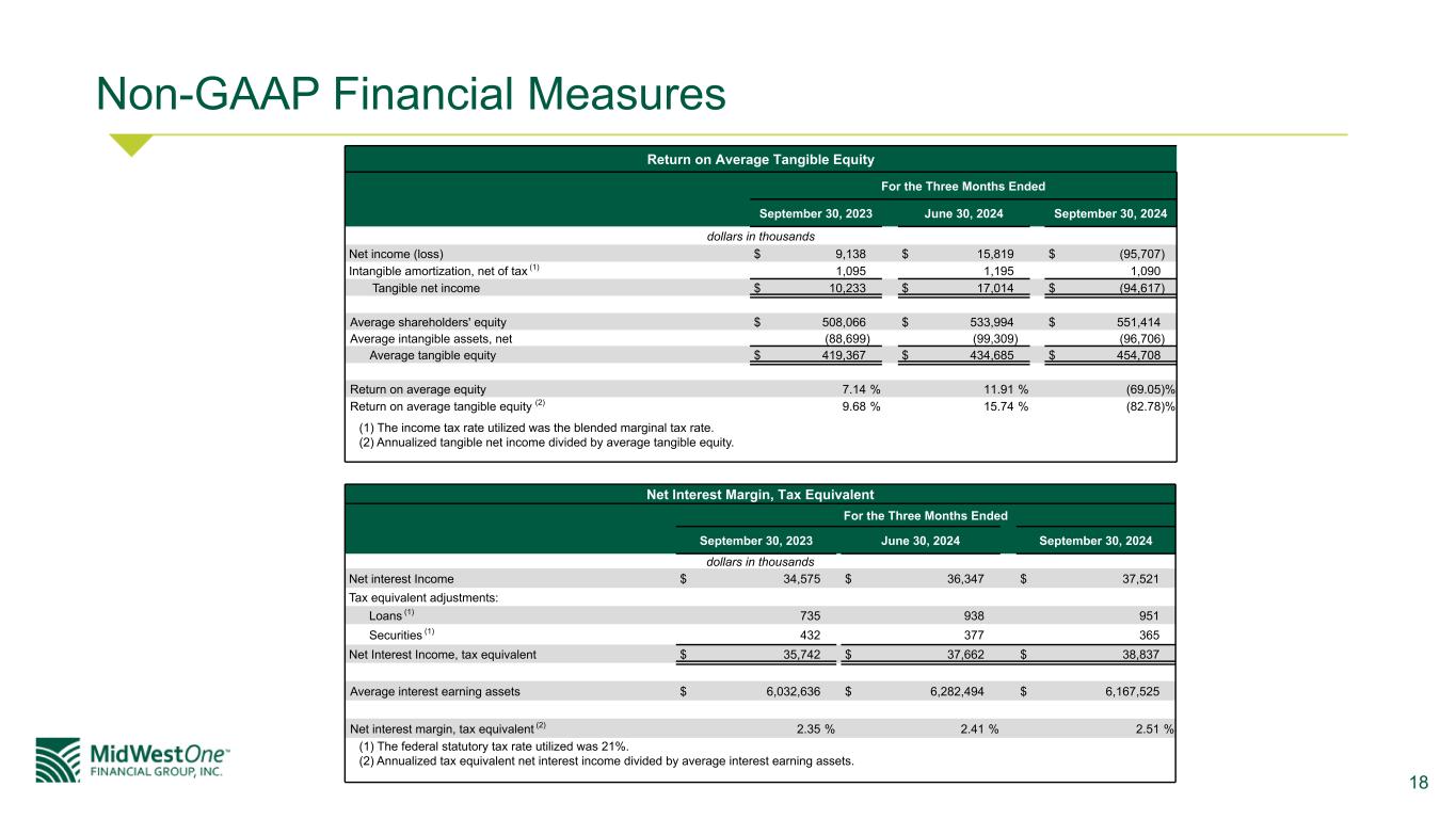 17 Non-GAAP Financial Measures Efficiency Ratio For the Three Months Ended September 30, 2023 June 30, 2024 September 30, 2024 dollars in thousands Total noninterest expense $ 31,544 $ 35,761 $ 35,798 Amortization of intangibles (1,460) (1,593) (1,470) Merger-related expenses (11) (854) (133) Noninterest expense used for efficiency ratio $ 30,073 $ 33,314 $ 34,195 Net interest income, tax equivalent (1) $ 35,742 $ 37,662 $ 38,837 Noninterest income 9,861 21,554 (130,388) Investment securities (losses) gains, net 79 33 (140,182) Net revenues used for efficiency ratio $ 45,524 $ 59,183 $ 48,631 Efficiency ratio 66.06 % 56.29 % 70.32 % (1) The federal statutory tax rate utilized was 21%. (2) Noninterest expense adjusted for amortization of intangibles and merger-related expenses divided by the sum of tax equivalent net interest income, noninterest income and net investment securities (losses) gains. Pre-tax / Pre-provision Net Revenue For the Three Months Ended September 30, 2023 June 30, 2024 September 30, 2024 dollars in thousands Net interest income $ 34,575 $ 36,347 $ 37,521 Noninterest income (loss) 9,861 21,554 (130,388) Noninterest expense (31,544) (35,761) (35,798) Pre-tax / Pre-provision Net Revenue $ 12,892 $ 22,140 $ (128,665)