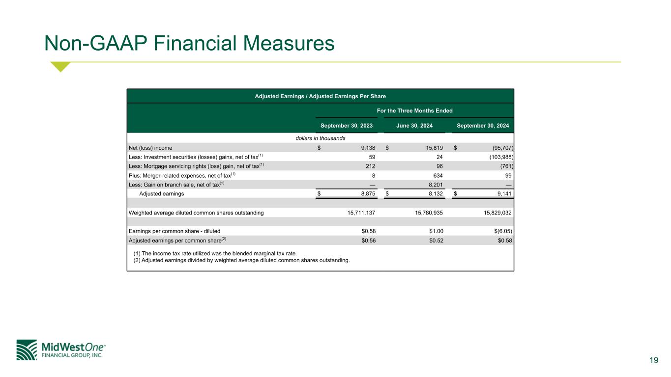 18 Non-GAAP Financial Measures Return on Average Tangible Equity For the Three Months Ended September 30, 2023 June 30, 2024 September 30, 2024 dollars in thousands Net income (loss) $ 9,138 $ 15,819 $ (95,707) Intangible amortization, net of tax (1) 1,095 1,195 1,090 Tangible net income $ 10,233 $ 17,014 $ (94,617) Average shareholders' equity $ 508,066 $ 533,994 $ 551,414 Average intangible assets, net (88,699) (99,309) (96,706) Average tangible equity $ 419,367 $ 434,685 $ 454,708 Return on average equity 7.14 % 11.91 % (69.05) % Return on average tangible equity (2) 9.68 % 15.74 % (82.78) % (1) The income tax rate utilized was the blended marginal tax rate. (2) Annualized tangible net income divided by average tangible equity. Net Interest Margin, Tax Equivalent For the Three Months Ended September 30, 2023 June 30, 2024 September 30, 2024 dollars in thousands Net interest Income $ 34,575 $ 36,347 $ 37,521 Tax equivalent adjustments: Loans (1) 735 938 951 Securities (1) 432 377 365 Net Interest Income, tax equivalent $ 35,742 $ 37,662 $ 38,837 Average interest earning assets $ 6,032,636 $ 6,282,494 $ 6,167,525 Net interest margin, tax equivalent (2) 2.35 % 2.41 % 2.51 % (1) The federal statutory tax rate utilized was 21%. (2) Annualized tax equivalent net interest income divided by average interest earning assets.
