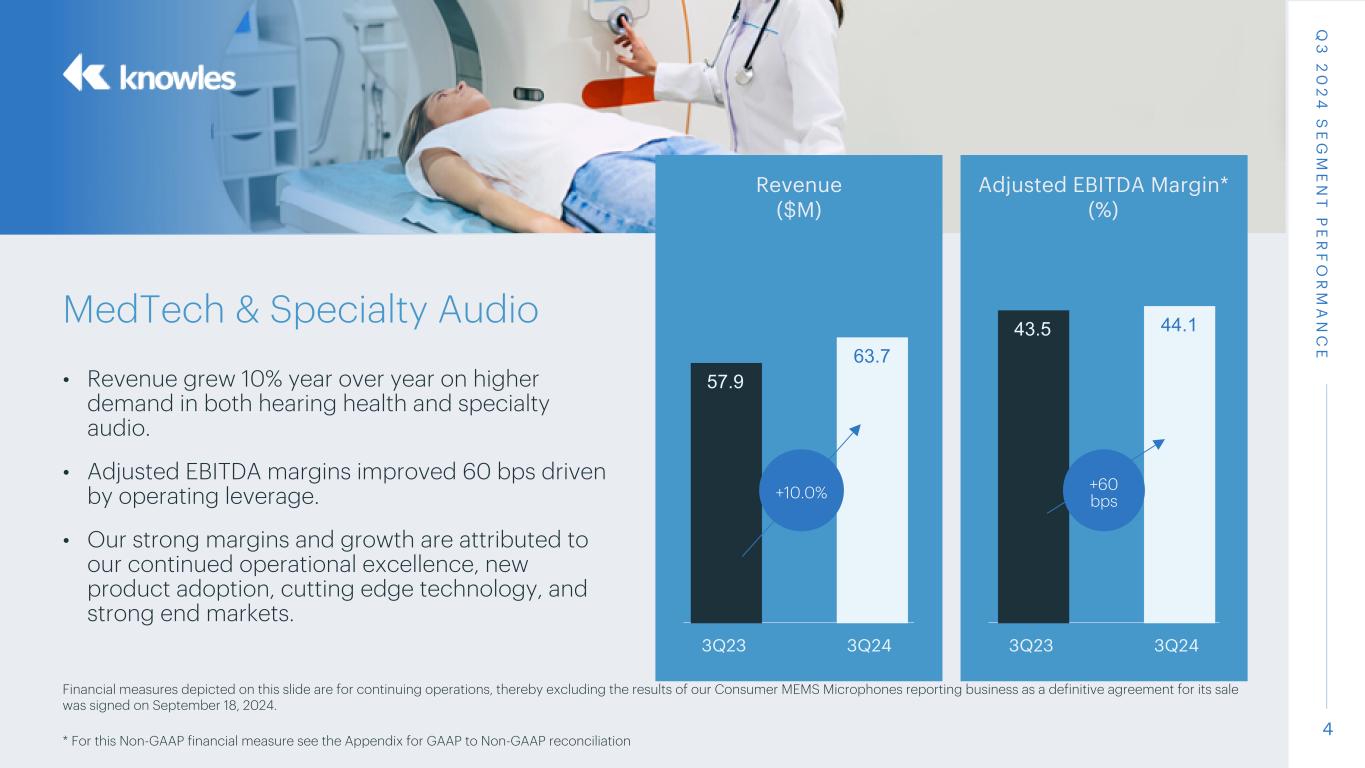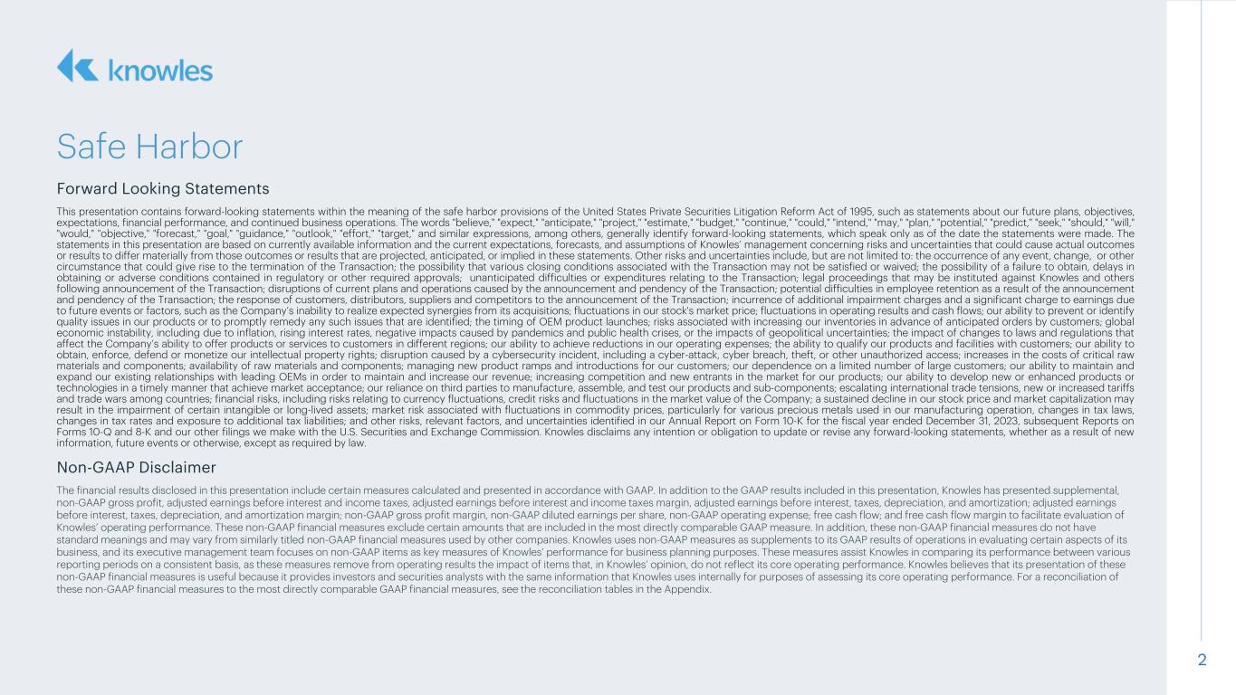 2 Safe Harbor Forward Looking Statements This presentation contains forward-looking statements within the meaning of the safe harbor provisions of the United States Private Securities Litigation Reform Act of 1995, such as statements about our future plans, objectives, expectations, financial performance, and continued business operations. The words "believe," "expect," "anticipate," "project," "estimate," "budget," "continue," "could," "intend," "may," "plan," "potential," "predict," "seek," "should," "will," "would," "objective," "forecast," "goal," "guidance," "outlook," "effort," "target," and similar expressions, among others, generally identify forward-looking statements, which speak only as of the date the statements were made. The statements in this presentation are based on currently available information and the current expectations, forecasts, and assumptions of Knowles’ management concerning risks and uncertainties that could cause actual outcomes or results to differ materially from those outcomes or results that are projected, anticipated, or implied in these statements. Other risks and uncertainties include, but are not limited to: the occurrence of any event, change, or other circumstance that could give rise to the termination of the Transaction; the possibility that various closing conditions associated with the Transaction may not be satisfied or waived; the possibility of a failure to obtain, delays in obtaining or adverse conditions contained in regulatory or other required approvals; unanticipated difficulties or expenditures relating to the Transaction; legal proceedings that may be instituted against Knowles and others following announcement of the Transaction; disruptions of current plans and operations caused by the announcement and pendency of the Transaction; potential difficulties in employee retention as a result of the announcement and pendency of the Transaction; the response of customers, distributors, suppliers and competitors to the announcement of the Transaction; incurrence of additional impairment charges and a significant charge to earnings due to future events or factors, such as the Company’s inability to realize expected synergies from its acquisitions; fluctuations in our stock's market price; fluctuations in operating results and cash flows; our ability to prevent or identify quality issues in our products or to promptly remedy any such issues that are identified; the timing of OEM product launches; risks associated with increasing our inventories in advance of anticipated orders by customers; global economic instability, including due to inflation, rising interest rates, negative impacts caused by pandemics and public health crises, or the impacts of geopolitical uncertainties; the impact of changes to laws and regulations that affect the Company’s ability to offer products or services to customers in different regions; our ability to achieve reductions in our operating expenses; the ability to qualify our products and facilities with customers; our ability to obtain, enforce, defend or monetize our intellectual property rights; disruption caused by a cybersecurity incident, including a cyber-attack, cyber breach, theft, or other unauthorized access; increases in the costs of critical raw materials and components; availability of raw materials and components; managing new product ramps and introductions for our customers; our dependence on a limited number of large customers; our ability to maintain and expand our existing relationships with leading OEMs in order to maintain and increase our revenue; increasing competition and new entrants in the market for our products; our ability to develop new or enhanced products or technologies in a timely manner that achieve market acceptance; our reliance on third parties to manufacture, assemble, and test our products and sub-components; escalating international trade tensions, new or increased tariffs and trade wars among countries; financial risks, including risks relating to currency fluctuations, credit risks and fluctuations in the market value of the Company; a sustained decline in our stock price and market capitalization may result in the impairment of certain intangible or long-lived assets; market risk associated with fluctuations in commodity prices, particularly for various precious metals used in our manufacturing operation, changes in tax laws, changes in tax rates and exposure to additional tax liabilities; and other risks, relevant factors, and uncertainties identified in our Annual Report on Form 10-K for the fiscal year ended December 31, 2023, subsequent Reports on Forms 10-Q and 8-K and our other filings we make with the U.S. Securities and Exchange Commission. Knowles disclaims any intention or obligation to update or revise any forward-looking statements, whether as a result of new information, future events or otherwise, except as required by law. Non-GAAP Disclaimer The financial results disclosed in this presentation include certain measures calculated and presented in accordance with GAAP. In addition to the GAAP results included in this presentation, Knowles has presented supplemental, non-GAAP gross profit, adjusted earnings before interest and income taxes, adjusted earnings before interest and income taxes margin, adjusted earnings before interest, taxes, depreciation, and amortization; adjusted earnings before interest, taxes, depreciation, and amortization margin; non-GAAP gross profit margin, non-GAAP diluted earnings per share, non-GAAP operating expense; free cash flow; and free cash flow margin to facilitate evaluation of Knowles’ operating performance. These non-GAAP financial measures exclude certain amounts that are included in the most directly comparable GAAP measure. In addition, these non-GAAP financial measures do not have standard meanings and may vary from similarly titled non-GAAP financial measures used by other companies. Knowles uses non-GAAP m