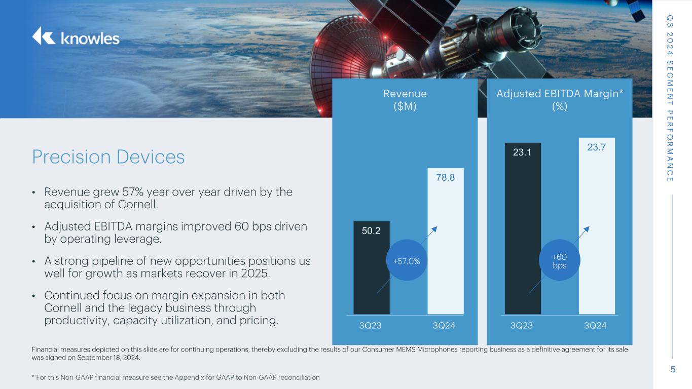 4 Financial measures depicted on this slide are for continuing operations, thereby excluding the results of our Consumer MEMS Microphones reporting business as a definitive agreement for its sale was signed on September 18, 2024. * For this Non-GAAP financial measure see the Appendix for GAAP to Non-GAAP reconciliation Q 3 2 0 2 4 S E G M E N T P E R F O R M A N C E MedTech & Specialty Audio • Revenue grew 10% year over year on higher demand in both hearing health and specialty audio. • Adjusted EBITDA margins improved 60 bps driven by operating leverage. • Our strong margins and growth are attributed to our continued operational excellence, new product adoption, cutting edge technology, and strong end markets. Revenue ($M) Adjusted EBITDA Margin* (%) 57.9 63.7 3Q23 3Q24 43.5 44.1 3Q23 3Q24 +10.0% +60 bps