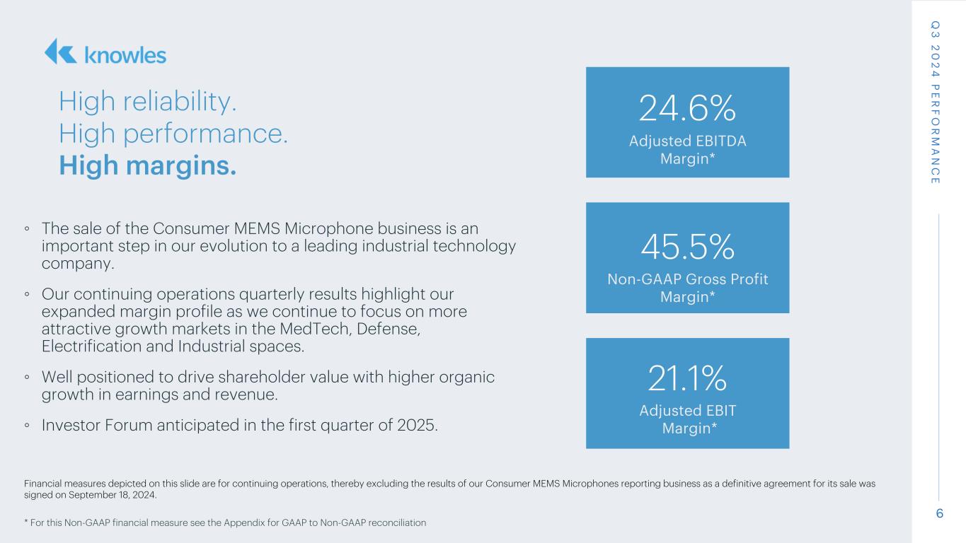 5 • Revenue grew 57% year over year driven by the acquisition of Cornell. • Adjusted EBITDA margins improved 60 bps driven by operating leverage. • A strong pipeline of new opportunities positions us well for growth as markets recover in 2025. • Continued focus on margin expansion in both Cornell and the legacy business through productivity, capacity utilization, and pricing. Financial measures depicted on this slide are for continuing operations, thereby excluding the results of our Consumer MEMS Microphones reporting business as a definitive agreement for its sale was signed on September 18, 2024. * For this Non-GAAP financial measure see the Appendix for GAAP to Non-GAAP reconciliation Precision Devices Q 3 2 0 2 4 S E G M E N T P E R F O R M A N C E Revenue ($M) 50.2 78.8 3Q23 3Q24 Adjusted EBITDA Margin* (%) +57.0% 23.1 23.7 3Q23 3Q24 +60 bps