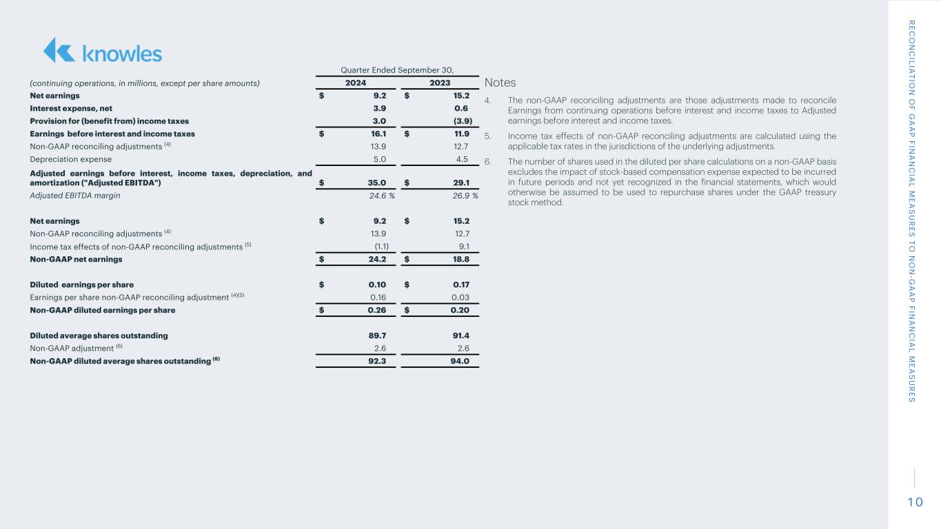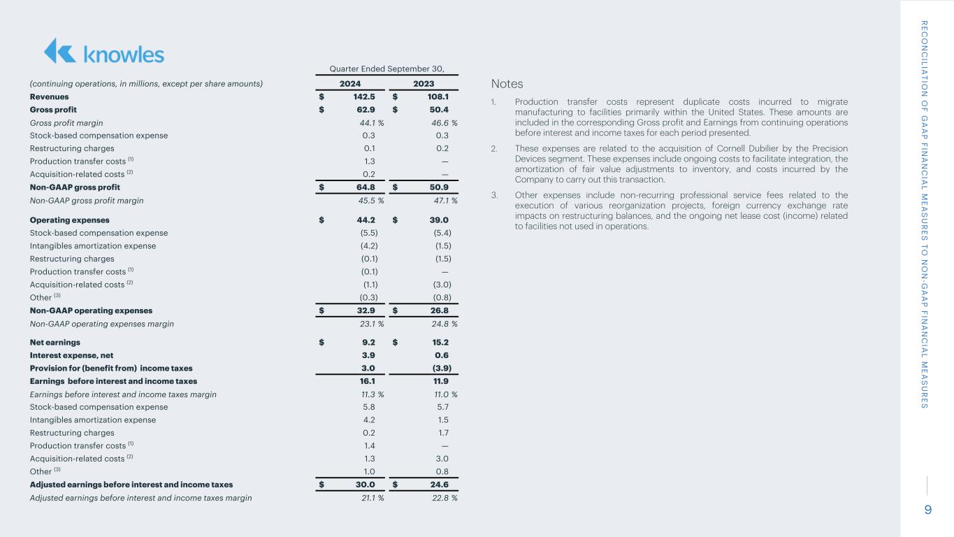 9 Notes 1. Production transfer costs represent duplicate costs incurred to migrate manufacturing to facilities primarily within the United States. These amounts are included in the corresponding Gross profit and Earnings from continuing operations before interest and income taxes for each period presented. 2. These expenses are related to the acquisition of Cornell Dubilier by the Precision Devices segment. These expenses include ongoing costs to facilitate integration, the amortization of fair value adjustments to inventory, and costs incurred by the Company to carry out this transaction. 3. Other expenses include non-recurring professional service fees related to the execution of various reorganization projects, foreign currency exchange rate impacts on restructuring balances, and the ongoing net lease cost (income) related to facilities not used in operations. R EC O N C ILIA TIO N O F G A A P FIN A N C IA L M EA S U R ES TO N O N -G A A P FIN A N C IA L M EA S U R ES Quarter Ended September 30, (continuing operations, in millions, except per share amounts) 2024 2023 Revenues $ 142.5 $ 108.1 Gross profit $ 62.9 $ 50.4 Gross profit margin 44.1 % 46.6 % Stock-based compensation expense 0.3 0.3 Restructuring charges 0.1 0.2 Production transfer costs (1) 1.3 — Acquisition-related costs (2) 0.2 — Non-GAAP gross profit $ 64.8 $ 50.9 Non-GAAP gross profit margin 45.5 % 47.1 % Operating expenses $ 44.2 $ 39.0 Stock-based compensation expense (5.5) (5.4) Intangibles amortization expense (4.2) (1.5) Restructuring charges (0.1) (1.5) Production transfer costs (1) (0.1) — Acquisition-related costs (2) (1.1) (3.0) Other (3) (0.3) (0.8) Non-GAAP operating expenses $ 32.9 $ 26.8 Non-GAAP operating expenses margin 23.1 % 24.8 % Net earnings $ 9.2 $ 15.2 Interest expense, net 3.9 0.6 Provision for (benefit from) income taxes 3.0 (3.9) Earnings before interest and income taxes 16.1 11.9 Earnings before interest and income taxes margin 11.3 % 11.0 % Stock-based compensation expense 5.8 5.7 Intangibles amortization expense 4.2 1.5 Restructuring charges 0.2 1.7 Production transfer costs (1) 1.4 — Acquisition-related costs (2) 1.3 3.0 Other (3) 1.0 0.8 Adjusted earnings before interest and income taxes $ 30.0 $ 24.6 Adjusted earnings before interest and income taxes margin 21.1 % 22.8 %