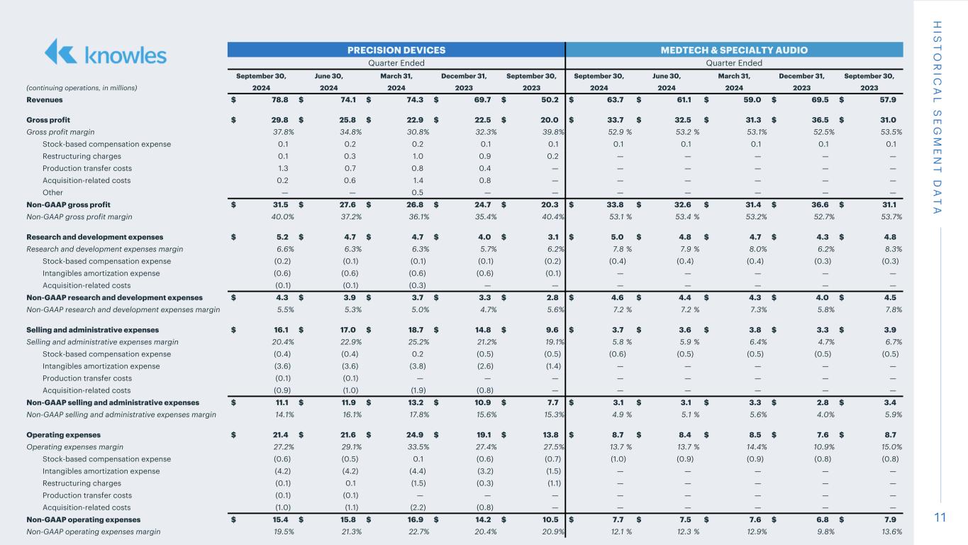 1 2 H IS T O R IC A L S E G M E N T D A T A PRECISION DEVICES MEDTECH & SPECIALTY AUDIO Quarter Ended Quarter Ended September 30, June 30, March 31, December 31, September 30, September 30, June 30, March 31, December 31, September 30, (continuing operations, in millions) 2024 2024 2024 2023 2023 2024 2024 2024 2023 2023 Revenues $ 78.8 $ 74.1 $ 74.3 $ 69.7 $ 50.2 $ 63.7 $ 61.1 $ 59.0 $ 69.5 $ 57.9 Operating earnings (loss) $ 8.4 $ 4.2 $ (2.0) $ 3.4 $ 6.2 $ 25.0 $ 24.1 $ 22.8 $ 28.9 $ 22.3 Other expense, net — — 0.1 — 0.1 — — — — — Earnings (loss) before interest and income taxes $ 8.4 $ 4.2 $ (2.1) $ 3.4 $ 6.1 $ 25.0 $ 24.1 $ 22.8 $ 28.9 $ 22.3 Earnings (loss) before interest and income taxes margin 10.7 % 5.7 % -2.8 % 4.9 % 12.2 % 39.2 % 39.4 % 38.6 % 41.6 % 38.5 % Stock-based compensation expense 0.7 0.7 0.1 0.7 0.8 1.1 1.0 1.0 0.9 0.9 Intangibles amortization expense 4.2 4.2 4.4 3.2 1.5 — — — — — Restructuring charges 0.2 0.2 2.5 1.2 1.3 — — — — — Production transfer costs 1.4 0.8 0.8 0.4 — — — — — — Acquisition-related costs 1.2 1.7 3.6 1.6 — — — — — — Other — — 0.5 — — — — — — — Adjusted earnings before interest and income taxes $ 16.1 $ 11.8 $ 9.8 $ 10.5 $ 9.7 $ 26.1 $ 25.1 $ 23.8 $ 29.8 $ 23.2 Adjusted earnings before interest and income taxes margin 20.4 % 15.9 % 13.2 % 15.1 % 19.3 % 41.0 % 41.1 % 40.3 % 42.9 % 40.1 % Operating earnings (loss) $ 8.4 $ 4.2 $ (2.0) $ 3.4 $ 6.2 $ 25.0 $ 24.1 $ 22.8 $ 28.9 $ 22.3 Other expense, net — — 0.1 — 0.1 — — — — — Earnings (loss) before interest and income taxes $ 8.4 $ 4.2 $ (2.1) $ 3.4 $ 6.1 $ 25.0 $ 24.1 $ 22.8 $ 28.9 $ 22.3 Non-GAAP reconciling adjustments 7.7 7.6 11.9 7.1 3.6 1.1 1.0 1.0 0.9 0.9 Depreciation expense 2.6 2.6 2.7 2.5 1.9 2.0 2.0 2.0 2.0 2.0 Adjusted earnings before interest, income taxes, depreciation, and amortization ("Adjusted EBITDA") $ 18.7 $ 14.4 $ 12.5 $ 13.0 $ 11.6 $ 28.1 $ 27.1 $ 25.8 $ 31.8 $ 25.2 Adjusted EBITDA margin 23.7 % 19.4 % 16.8 % 18.7 % 23.1 % 44.1 % 44.4 % 43.7 % 45.8 % 43.5 %