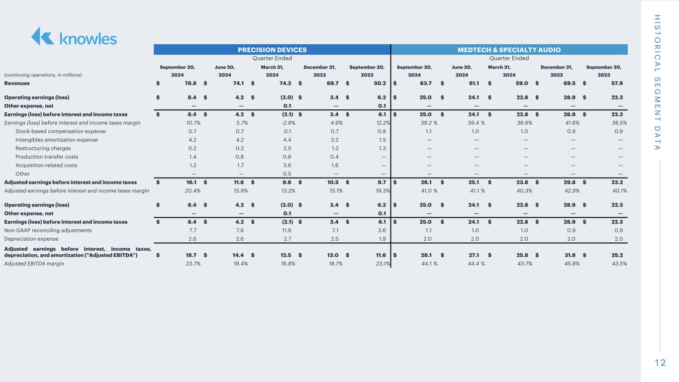 11 H IS T O R IC A L S E G M E N T D A T A PRECISION DEVICES MEDTECH & SPECIALTY AUDIO Quarter Ended Quarter Ended September 30, June 30, March 31, December 31, September 30, September 30, June 30, March 31, December 31, September 30, (continuing operations, in millions) 2024 2024 2024 2023 2023 2024 2024 2024 2023 2023 Revenues $ 78.8 $ 74.1 $ 74.3 $ 69.7 $ 50.2 $ 63.7 $ 61.1 $ 59.0 $ 69.5 $ 57.9 Gross profit $ 29.8 $ 25.8 $ 22.9 $ 22.5 $ 20.0 $ 33.7 $ 32.5 $ 31.3 $ 36.5 $ 31.0 Gross profit margin 37.8 % 34.8 % 30.8 % 32.3 % 39.8 % 52.9 % 53.2 % 53.1 % 52.5 % 53.5 % Stock-based compensation expense 0.1 0.2 0.2 0.1 0.1 0.1 0.1 0.1 0.1 0.1 Restructuring charges 0.1 0.3 1.0 0.9 0.2 — — — — — Production transfer costs 1.3 0.7 0.8 0.4 — — — — — — Acquisition-related costs 0.2 0.6 1.4 0.8 — — — — — — Other — — 0.5 — — — — — — — Non-GAAP gross profit $ 31.5 $ 27.6 $ 26.8 $ 24.7 $ 20.3 $ 33.8 $ 32.6 $ 31.4 $ 36.6 $ 31.1 Non-GAAP gross profit margin 40.0 % 37.2 % 36.1 % 35.4 % 40.4 % 53.1 % 53.4 % 53.2 % 52.7 % 53.7 % Research and development expenses $ 5.2 $ 4.7 $ 4.7 $ 4.0 $ 3.1 $ 5.0 $ 4.8 $ 4.7 $ 4.3 $ 4.8 Research and development expenses margin 6.6 % 6.3 % 6.3 % 5.7 % 6.2 % 7.8 % 7.9 % 8.0 % 6.2 % 8.3 % Stock-based compensation expense (0.2) (0.1) (0.1) (0.1) (0.2) (0.4) (0.4) (0.4) (0.3) (0.3) Intangibles amortization expense (0.6) (0.6) (0.6) (0.6) (0.1) — — — — — Acquisition-related costs (0.1) (0.1) (0.3) — — — — — — — Non-GAAP research and development expenses $ 4.3 $ 3.9 $ 3.7 $ 3.3 $ 2.8 $ 4.6 $ 4.4 $ 4.3 $ 4.0 $ 4.5 Non-GAAP research and development expenses margin 5.5 % 5.3 % 5.0 % 4.7 % 5.6 % 7.2 % 7.2 % 7.3 % 5.8 % 7.8 % Selling and administrative expenses $ 16.1 $ 17.0 $ 18.7 $ 14.8 $ 9.6 $ 3.7 $ 3.6 $ 3.8 $ 3.3 $ 3.9 Selling and administrative expenses margin 20.4 % 22.9 % 25.2 % 21.2 % 19.1 % 5.8 % 5.9 % 6.4 % 4.7 % 6.7 % Stock-based compensation expense (0.4) (0.4) 0.2 (0.5) (0.5) (0.6) (0.5) (0.5) (0.5) (0.5) Intangibles amortization expense (3.6) (3.6) (3.8) (2.6) (1.4) — — — — — Production transfer costs (0.1) (0.1) — — — — — — — — Acquisition-related costs (0.9) (1.0) (1.9) (0.8) — — — — — — Non-GAAP selling and administrative expenses $ 11.1 $ 11.9 $ 13.2 $ 10.9 $ 7.7 $ 3.1 $ 3.1 $ 3.3 $ 2.8 $ 3.4 Non-GAAP selling and administrative expenses margin 14.1 % 16.1 % 17.8 % 15.6 % 15.3 % 4.9 % 5.1 % 5.6 % 4.0 % 5.9 % Operating expenses $ 21.4 $ 21.6 $ 24.9 $ 19.1 $ 13.8 $ 8.7 $ 8.4 $ 8.5 $ 7.6 $ 8.7 Operating expenses margin 27.2 % 29.1 % 33.5 % 27.4 % 27.5 % 13.7 % 13.7 % 14.4 % 10.9 % 15.0 % Stock-based compensation expense (0.6) (0.5) 0.1 (0.6) (0.7) (1.0) (0.9) (0.9) (0.8) (0.8) Intangibles amortization expense (4.2) (4.2) (4.4) (3.2) (1.5) — — — — — Restructuring charges (0.1) 0.1 (1.5) (0.3) (1.1) — — — — — Production transfer costs (0.1) (0.1) — — — — — — — — Acquisition-related costs (1.0) (1.1) (2.2) (0.8) — — — — — — Non-GAAP operating expenses $ 15.4 $ 15.8 $ 16.9 $ 14.2 $ 10.5 $ 7.7 $ 7.5 $ 7.6 $ 6.8 $ 7.9 Non-GAAP operating expenses margin 19.5 % 21.3 % 22.7 % 20.4 % 20.9 % 12.1 % 12.3 % 12.9 % 9.8 % 13.6 %